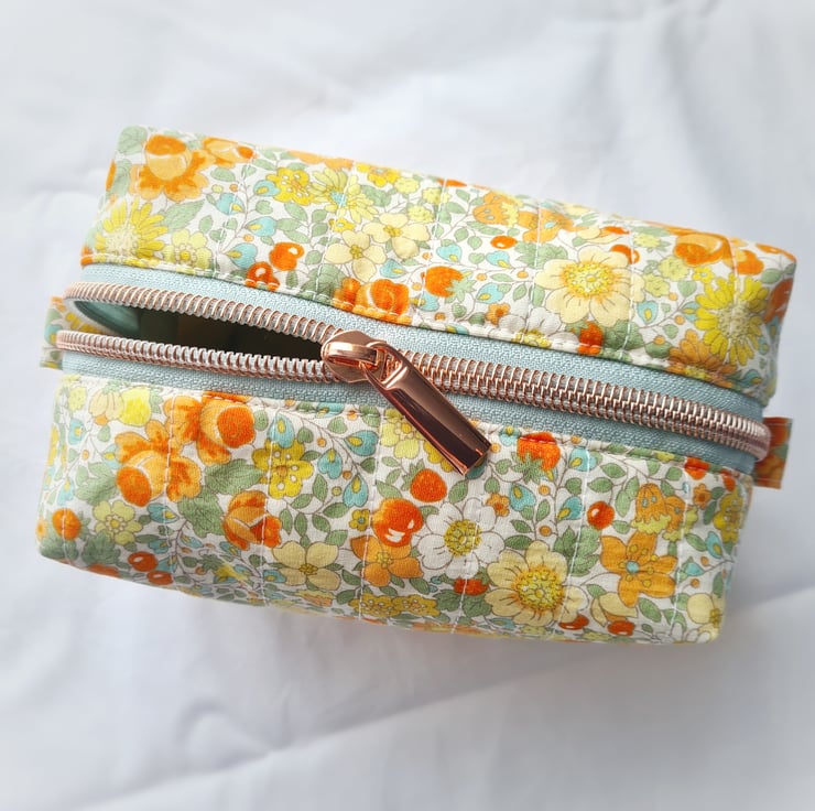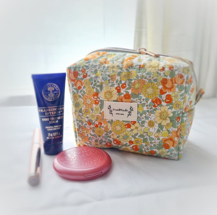 This dainty make up bag is made using high quality cotton fabric with a cute retro style floral and fruit design and is hand quilted by myself. The lining is a lilac cotton and it is finished with a rose gold zip and a cute 'Handmade' label. Perfect for make up or bits and bobs on the go!