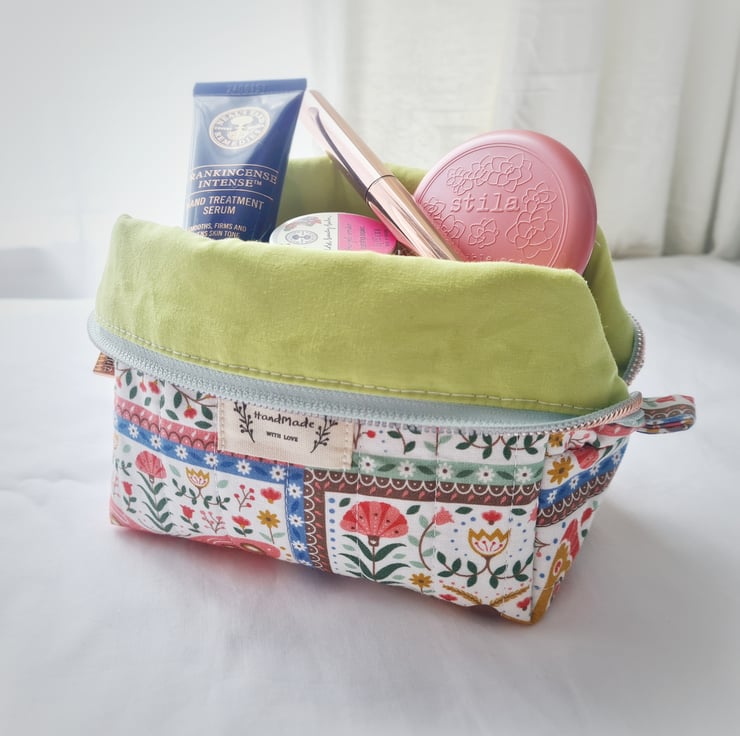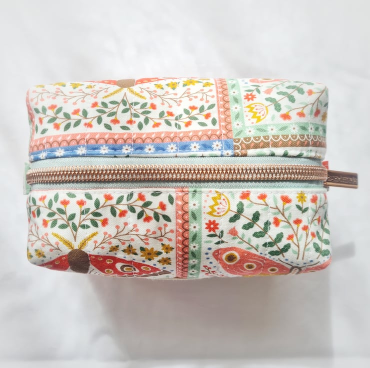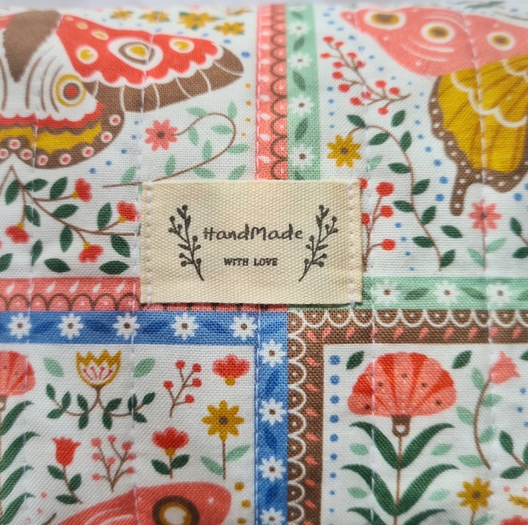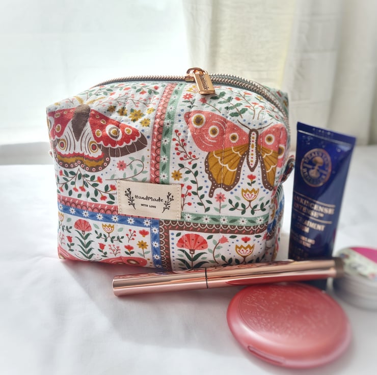 This dainty make up bag is made using high quality cotton fabric with a cute moth and butterfly design and is hand quilted by myself. The lining is a lime green cotton and it is finished with a rose gold zip and a cute 'Handmade' label. Perfect for make up or bits and bobs on the go!