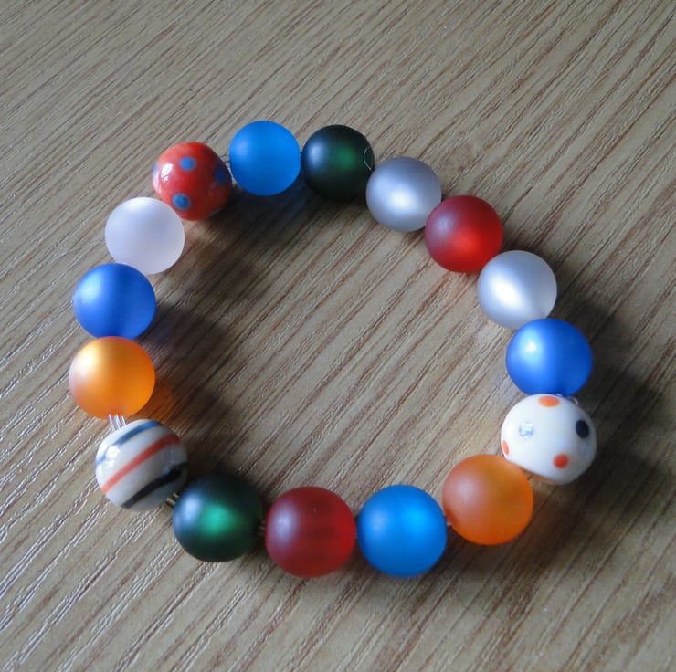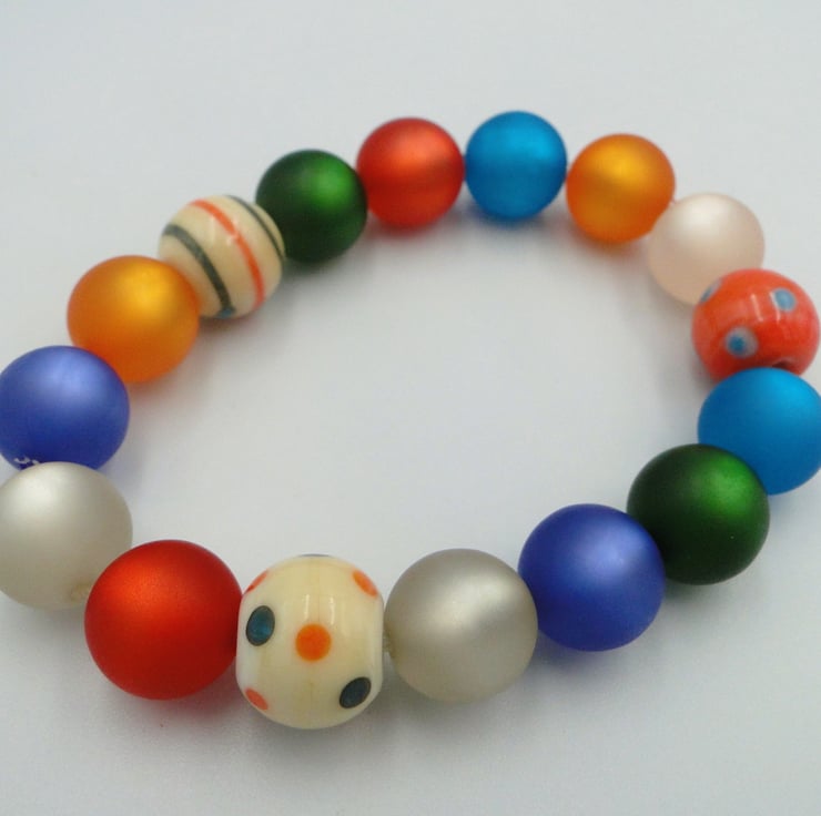 A multi coloured bracelet on stretch fiber. 1 striped and 2 spotty handmade glass beads with matt coloured beads