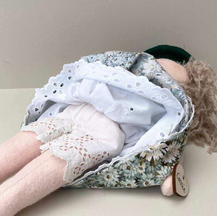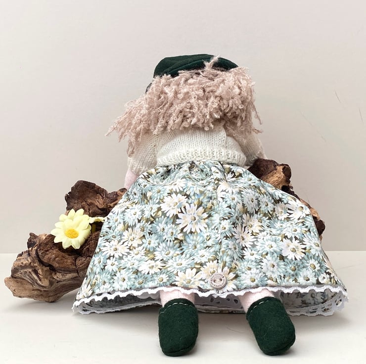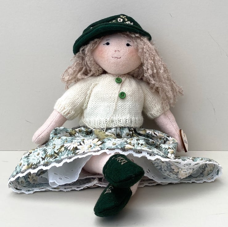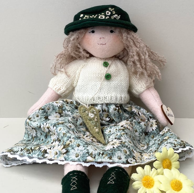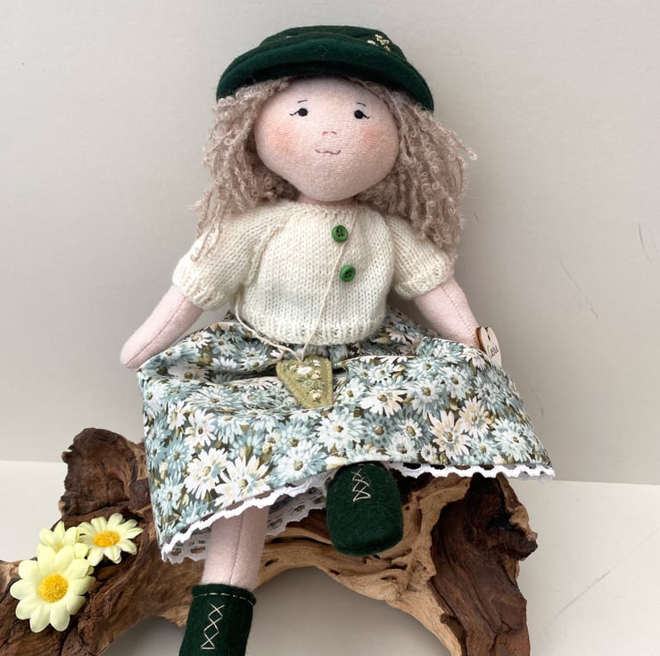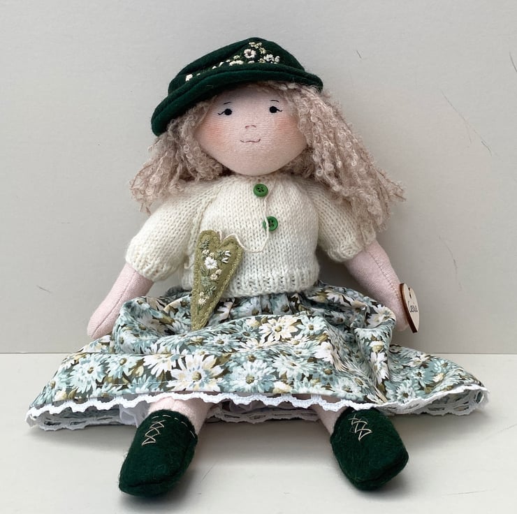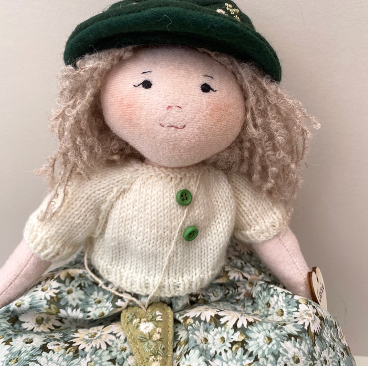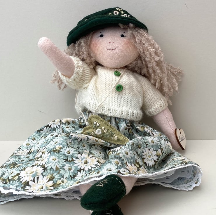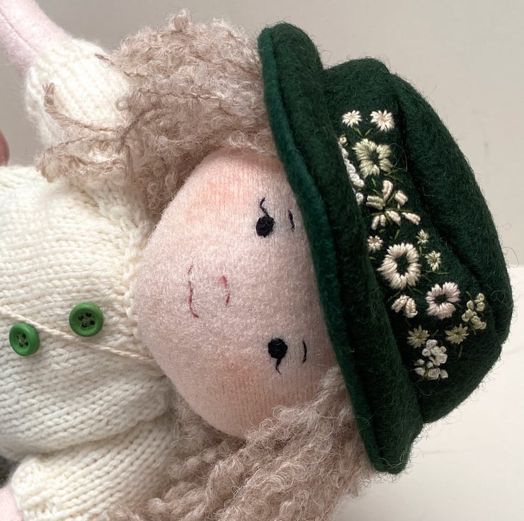 Her shoes were made from forest green wool felt and she wears a hat to match which I have decorated with floral hand embroidery to the front of the band. She has a small sage green hand embroidered heart around her neck and her name is on a wooden tag to one wrist.