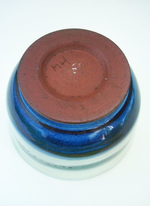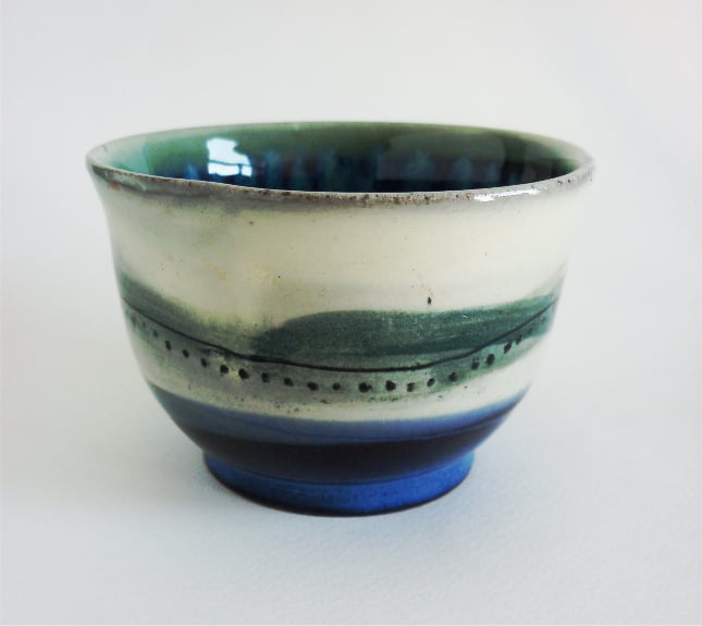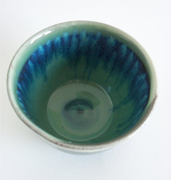 Outside of the bowl is green washes of glaze, with a bluer glaze at the base.