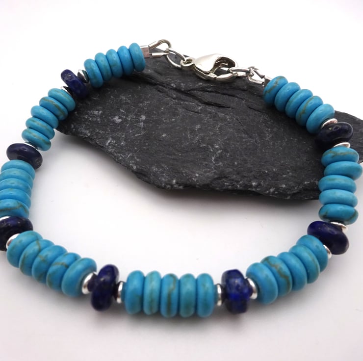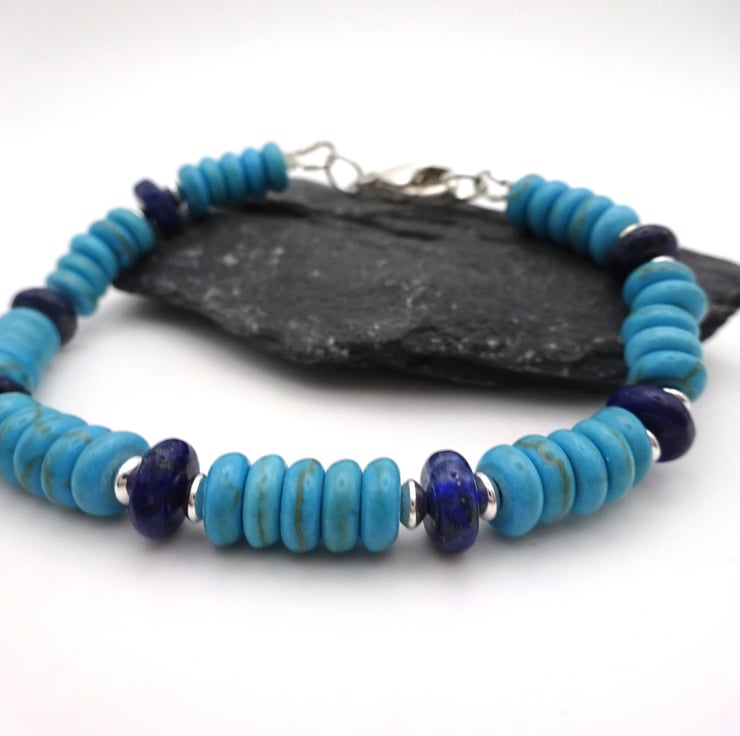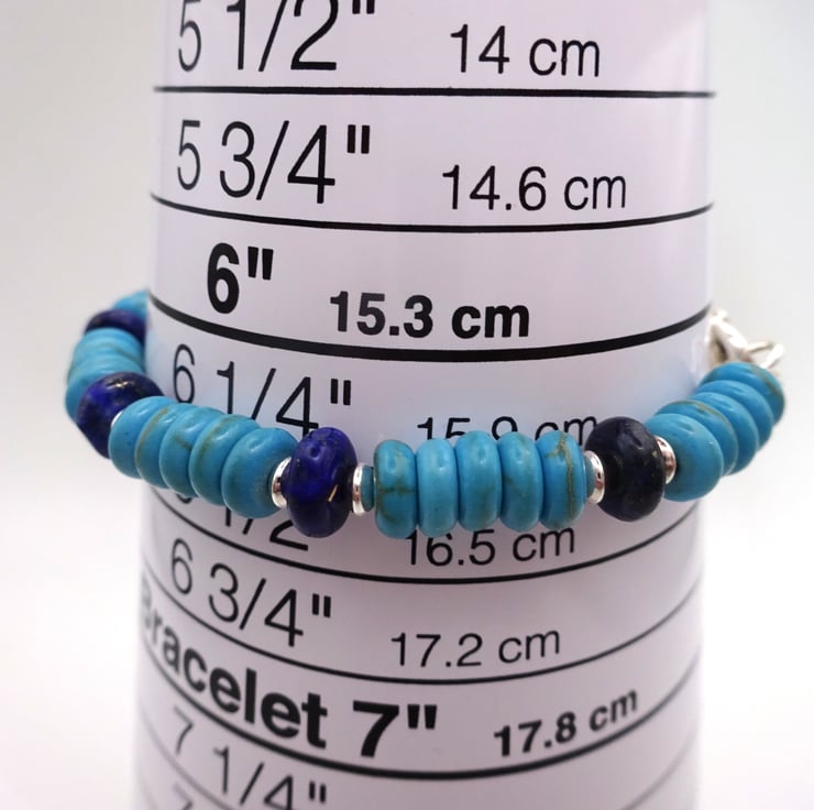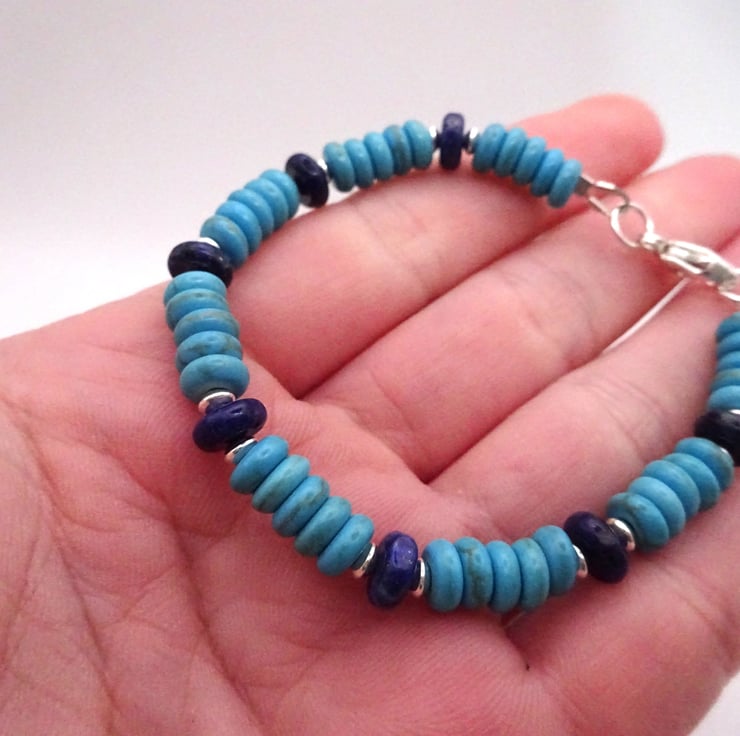 A beaded bracelet made with Blue Howlite and Lapis disc beads strung with sterling silver beads.