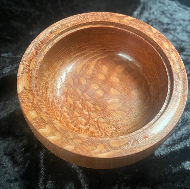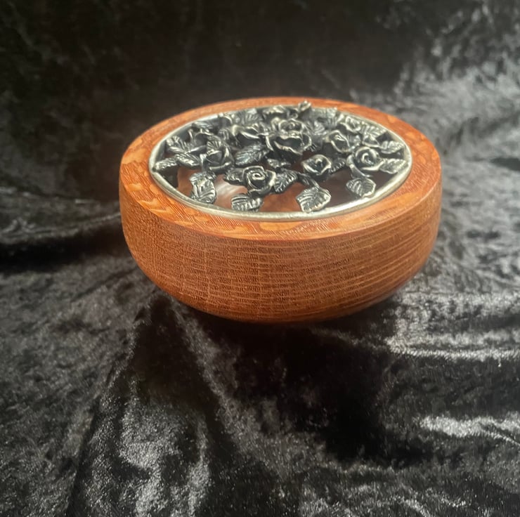 A lovely little bowl formed from lacewood which has a gorgeous grain and is finished with hardwax to give a lasting shine.. The perforated metal lid has a rose theme Approx 4" diameter x 2" high it will grace its location