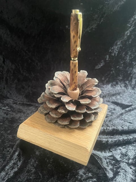 A twist action ball pen made from a fir cone to give a unique finish. I have paired it with a stand again using a fir cone to create a unique combination.. It could grace a desk or sinilar location. I have graded the front of the base to take an engraved plaque to turn it into a presentation piece