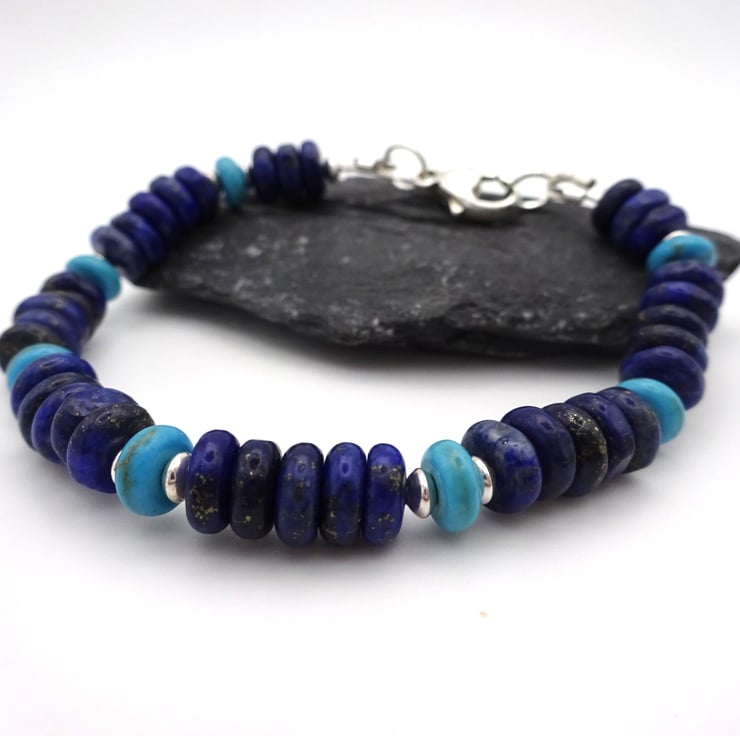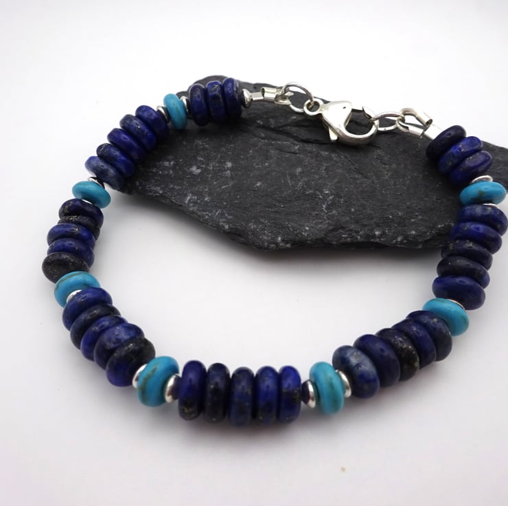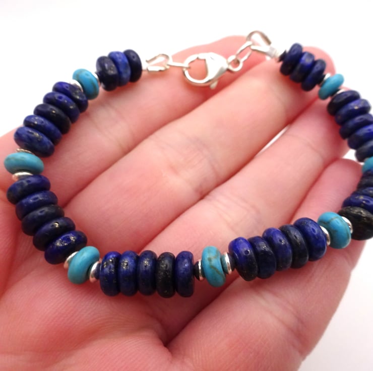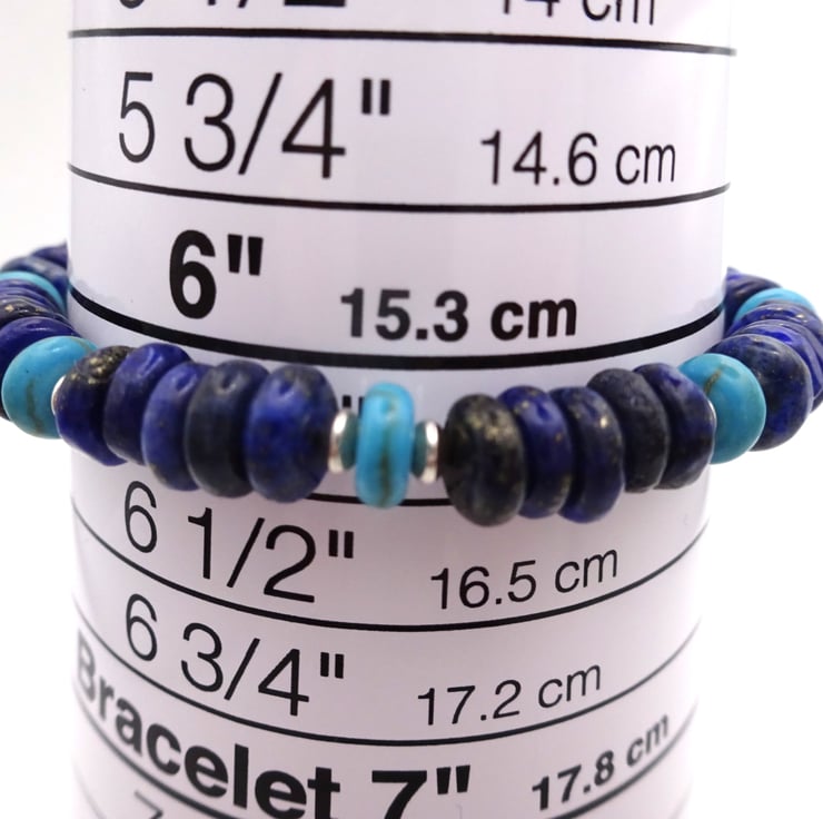 A beaded bracelet made with Blue Howlite and Lapis disc beads strung with sterling silver beads.