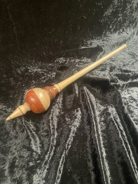 A lovely support spindle made from a mix of hardwoods, rosewood,beech, mahogany and ash. It weighs 2.4 oz (67 grams) and is 12" long (310mm) and approx 45mm diameter. It has a good spin
