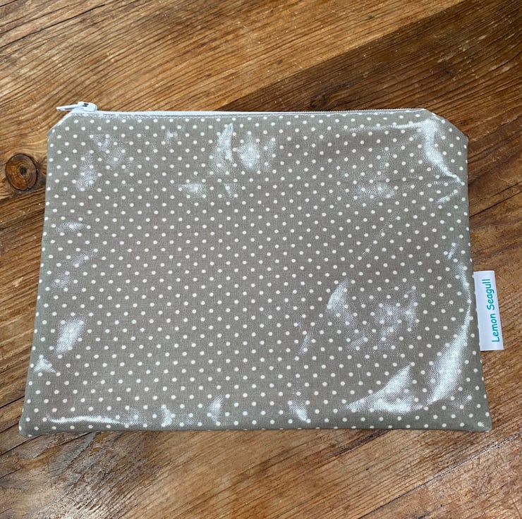 This make up bag is made from a grey oil cloth with white spots. The bag is lined with an orange cotton fabric and a white zip.