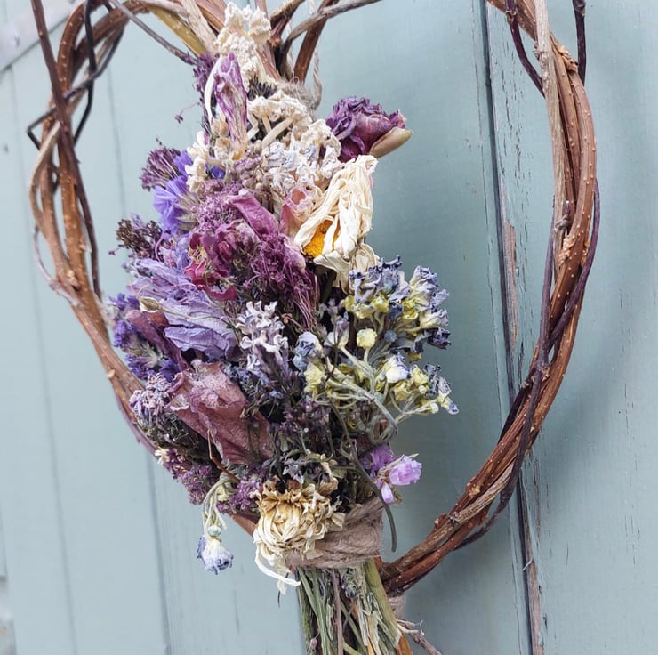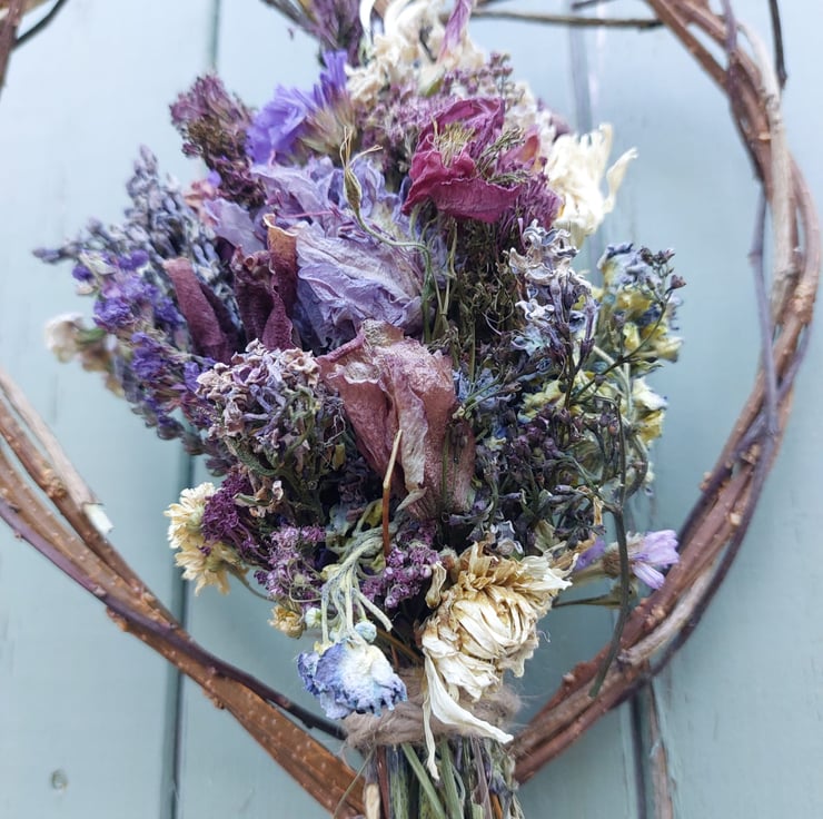 A handmade dried flower heart shape decoration measuring approximately 27x22cm at it’s longest and widest points.