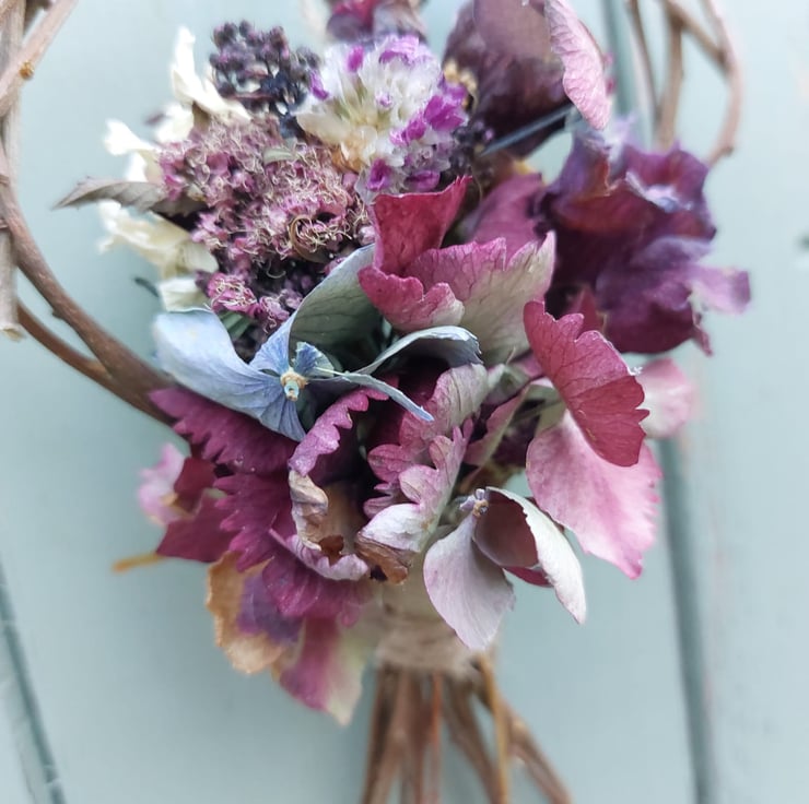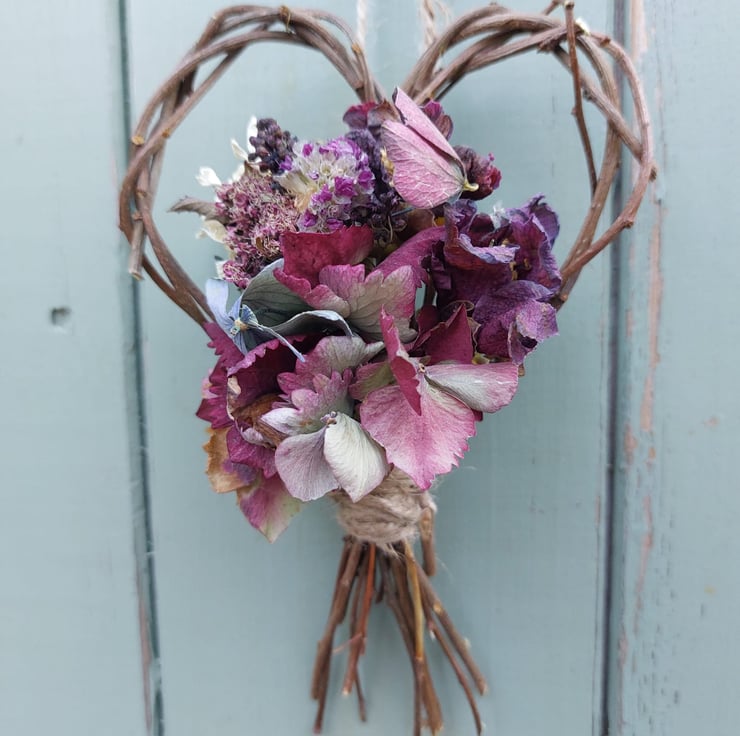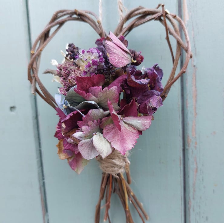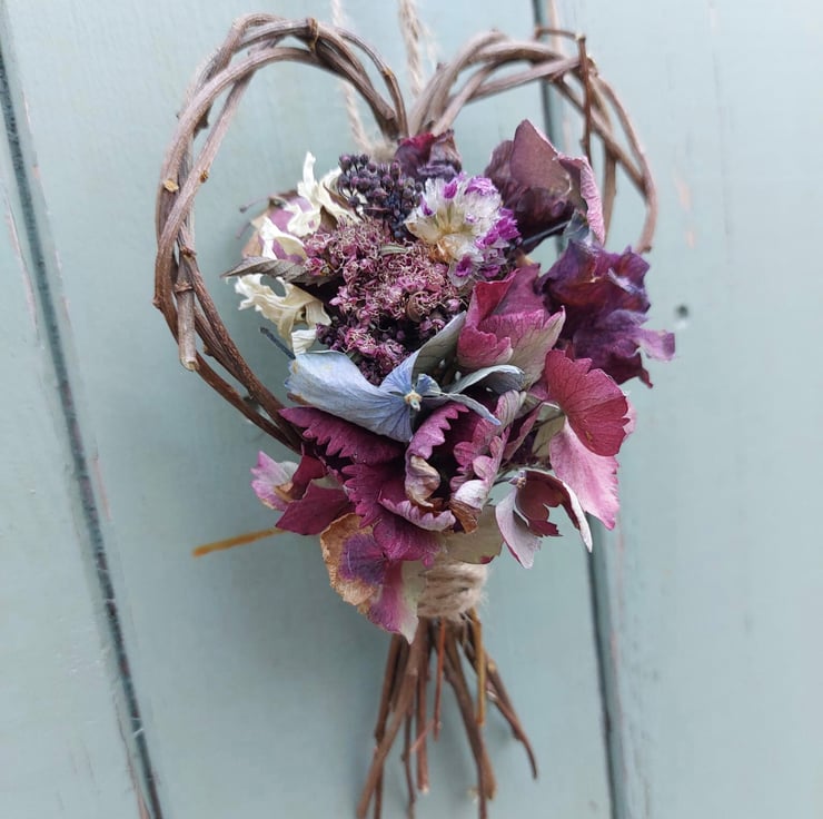 A handmade dried flower small heart shape decoration measuring approximately 17x10cm at it’s longest and widest points.