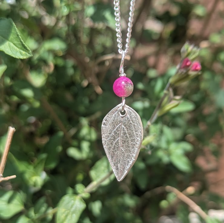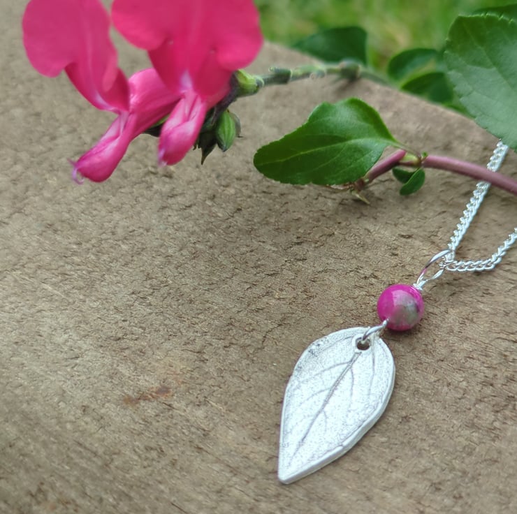 I wanted to make some personal pieces from the plants in my garden, and I love the flowers on my blackcurrant sage plant, so I combined a silver leaf pendant with this vibrant pink chalcedony bead.