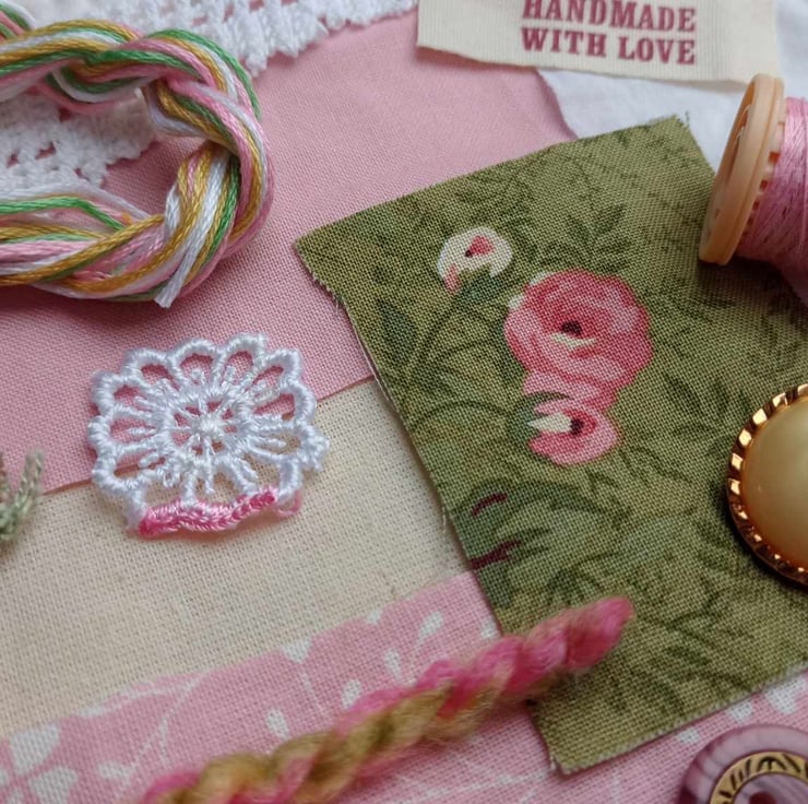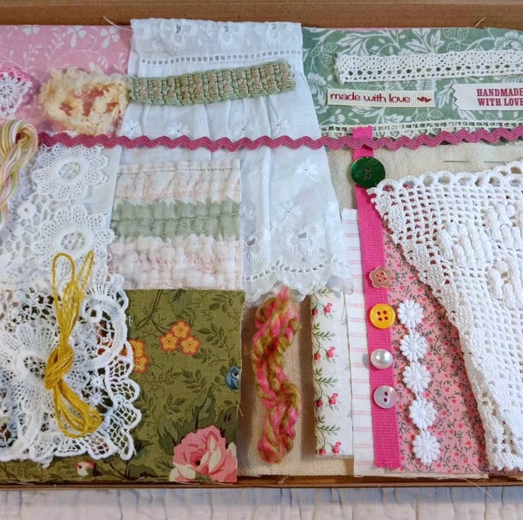 Floral fabric inspiration bundle - stuffed full of antique, vintage and pre-loved textiles, haberdashery and trims. These packs have been inspired by vintage Laura Ashley fabric in delicate floral prints, and are ideal for slow stitching, textile art and small craft projects.