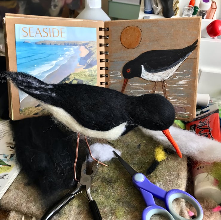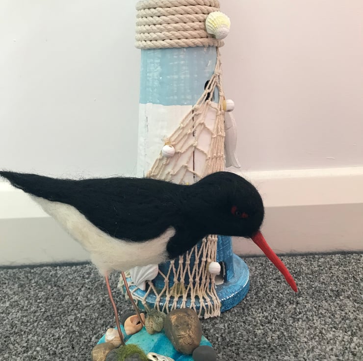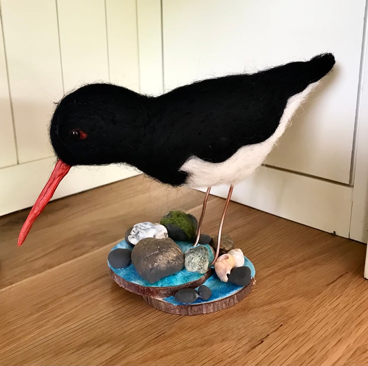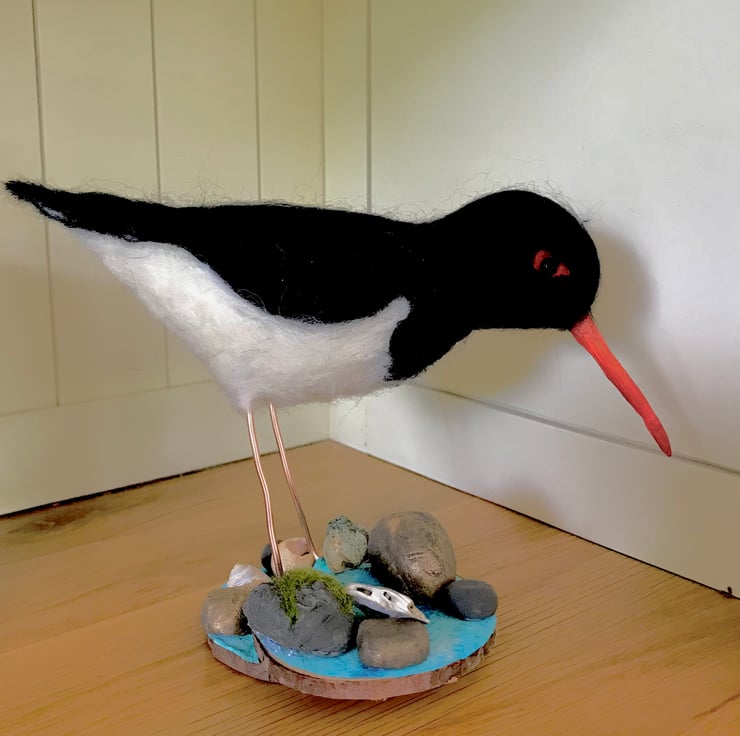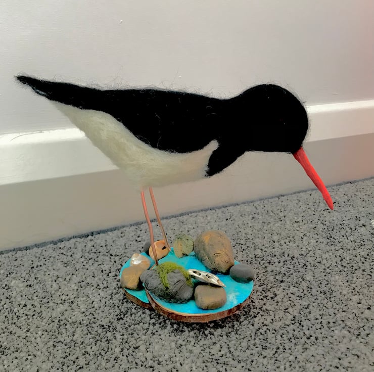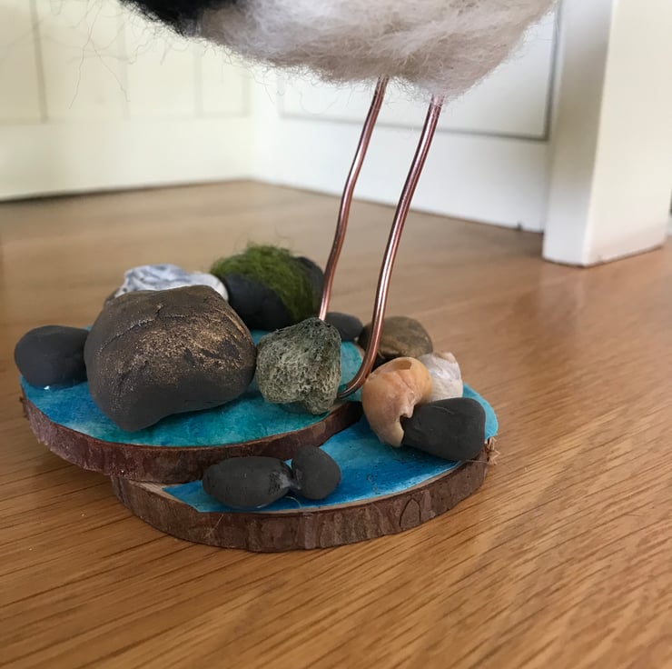 He stands on wood slices, hand painted paper for water , shells and air dried clay pebbles looking around for food.