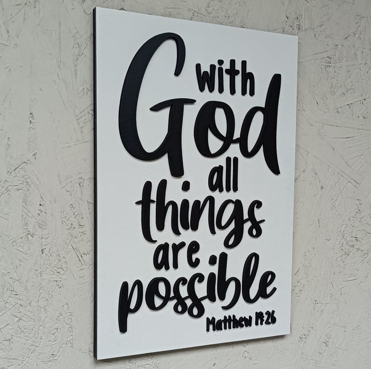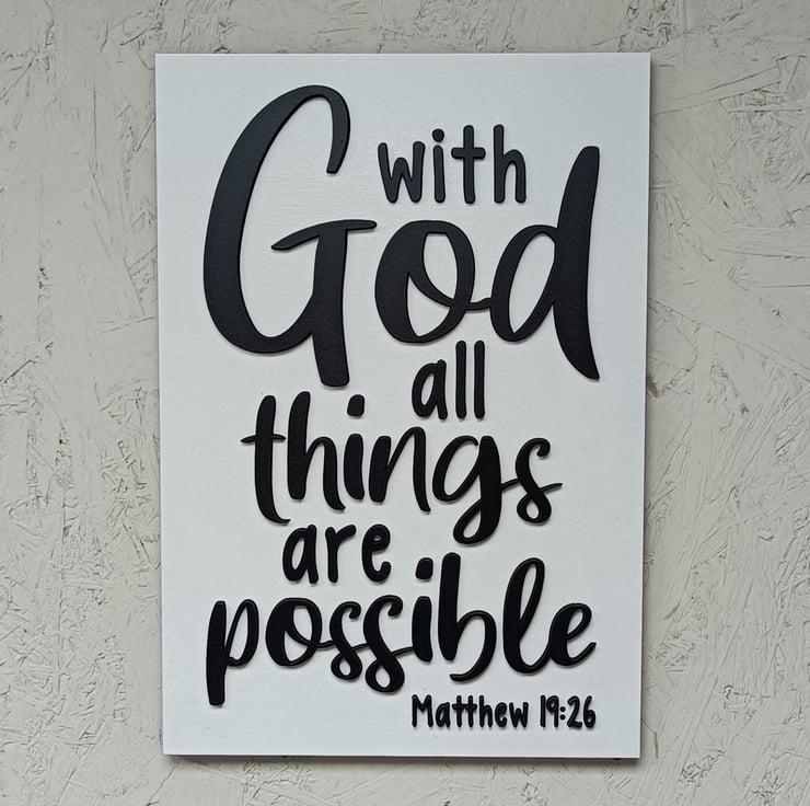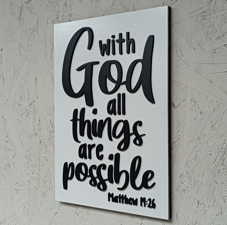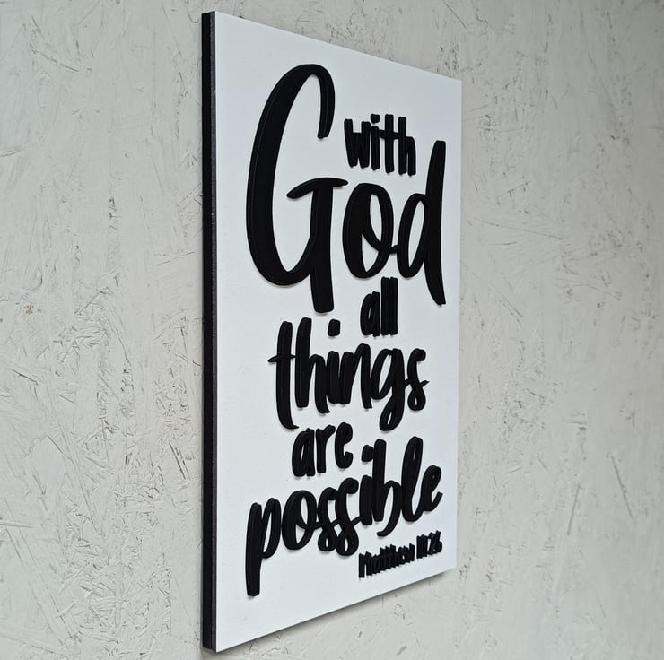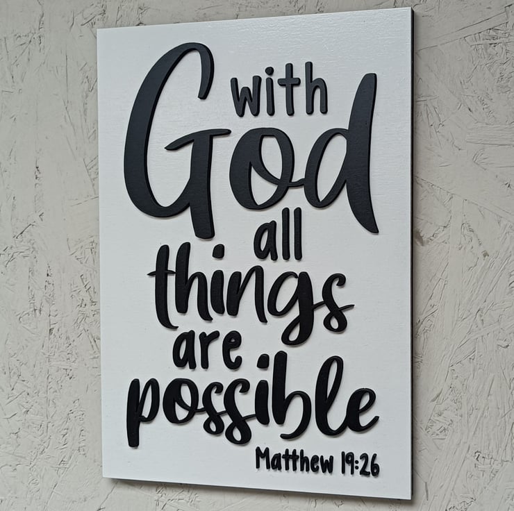 A beautiful piece of Christian 3D wall décor that will brighten up any space, and reminds us, from bible verse Mathew 19:26, that With God All Things Are Possible