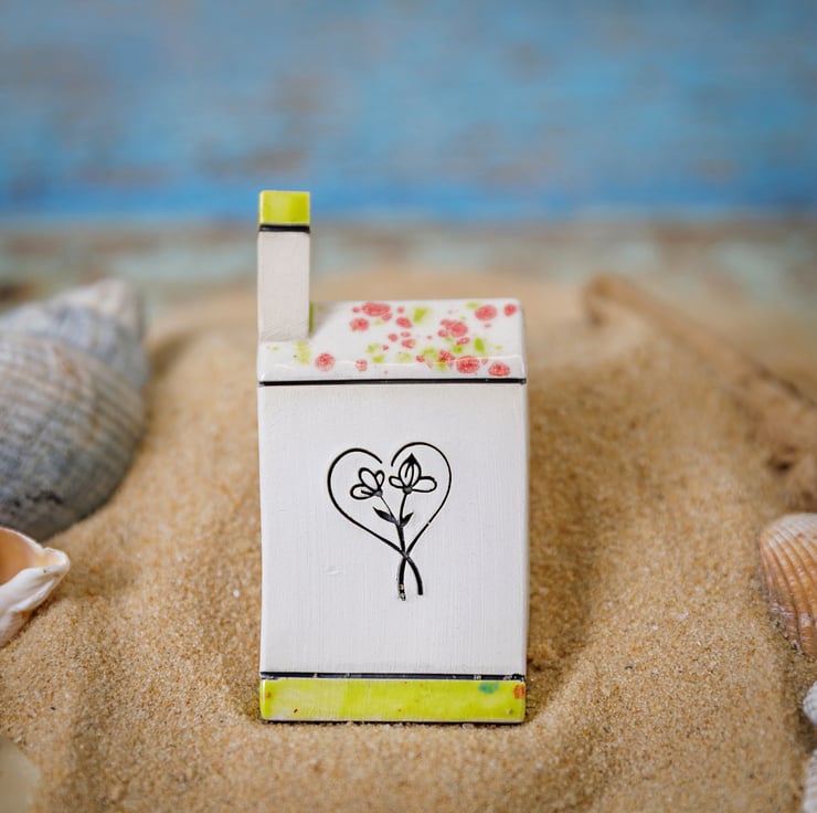 It is made by hand from smooth sandstone clay, coloured underglazes and a glossy glaze for shine.