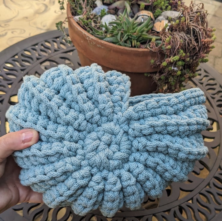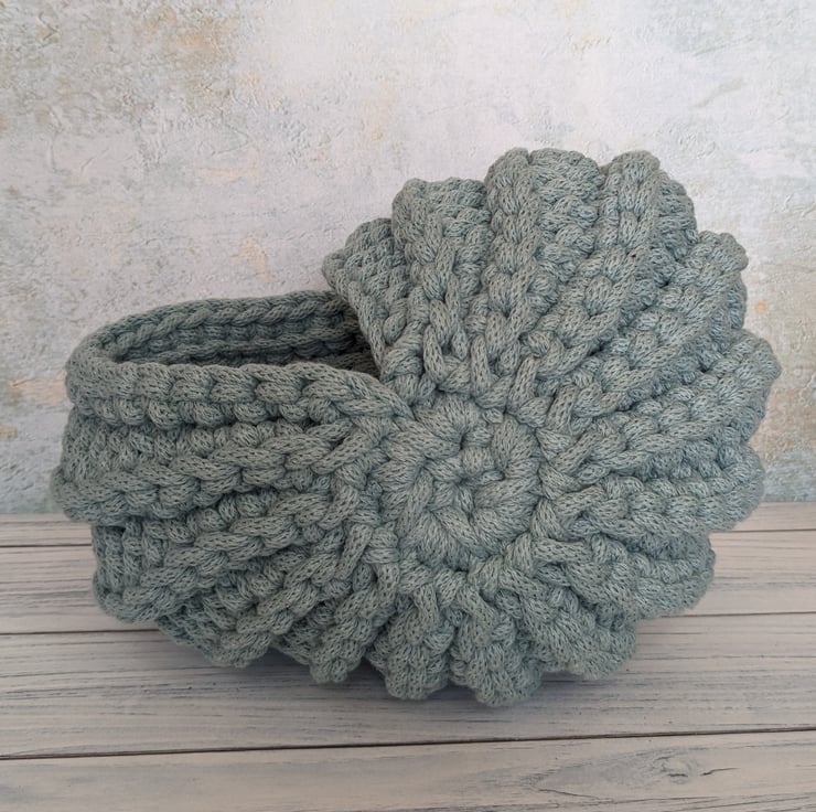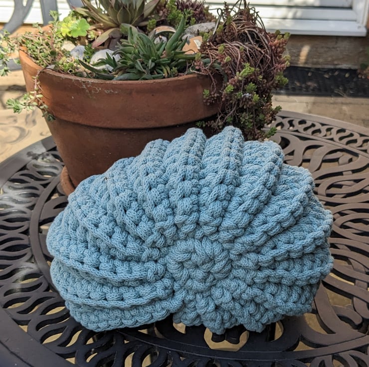 A beautifully tactile crocheted ammonite in duck egg blue made with a premium recycled 100% cotton braided cord. The item is very sturdy and keeps its shape and the cord gives great definition to the crochet stitches used to create it.