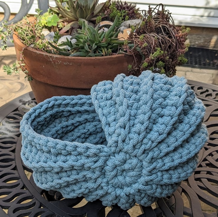 It would look equally good on display by itself as a feature in a room, or as a container for a small houseplant, or as useful storage in the bathroom or nursery. The pattern describes it as an ammonite but it is also the shape of a nautilus shell so would fit in well with a seaside theme.