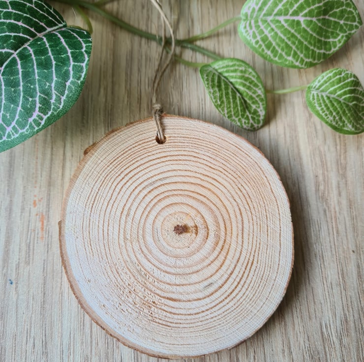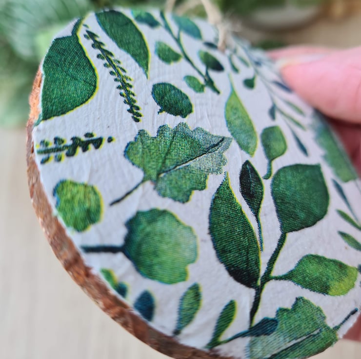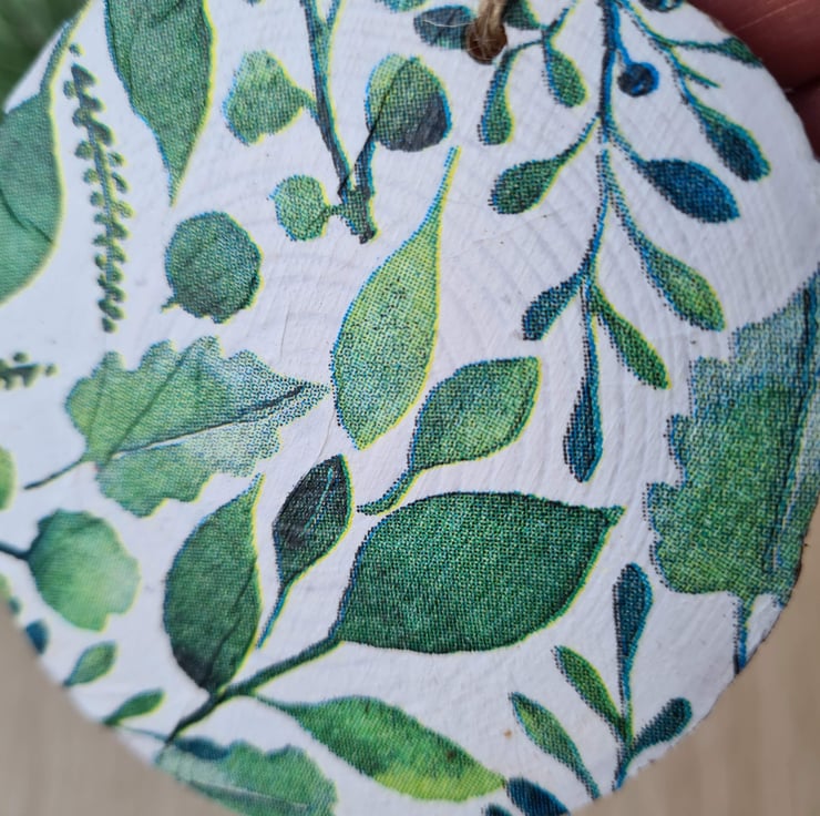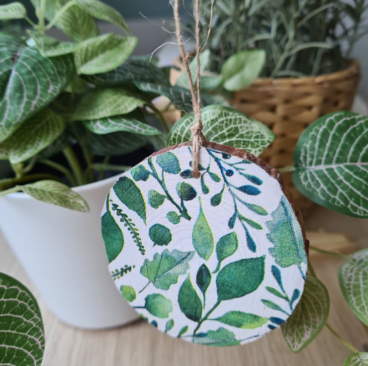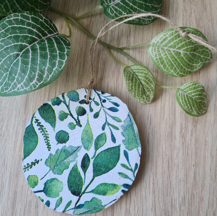 This wood slice hanging decoration has been painted then decorated with decoupage using a stylish green foliage design paper napkin. It has been sealed with varnish and finished with twine. It is unsealed on the back.