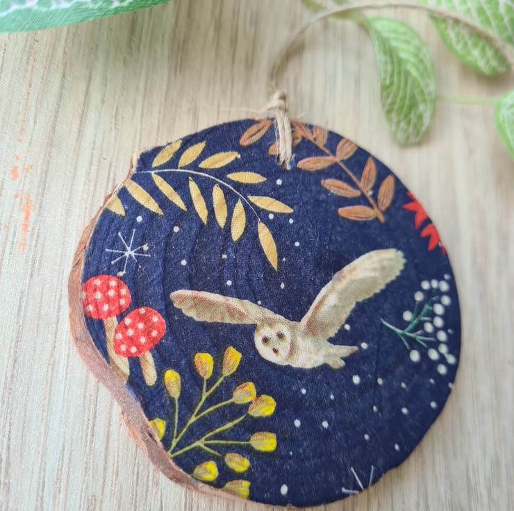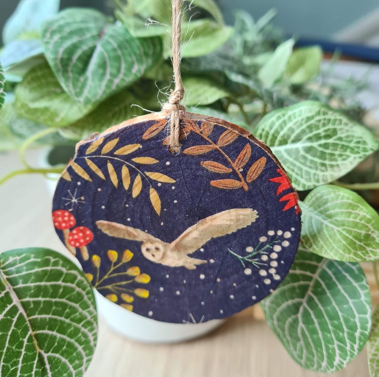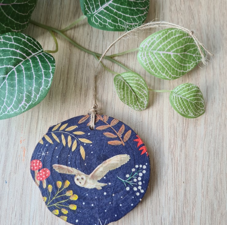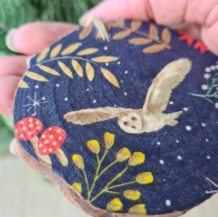 This wood slice hanging decoration has been decorated with decoupage using a beautiful woodland owl design paper napkin. It has been sealed with varnish and finished with twine. It is unsealed on the back.