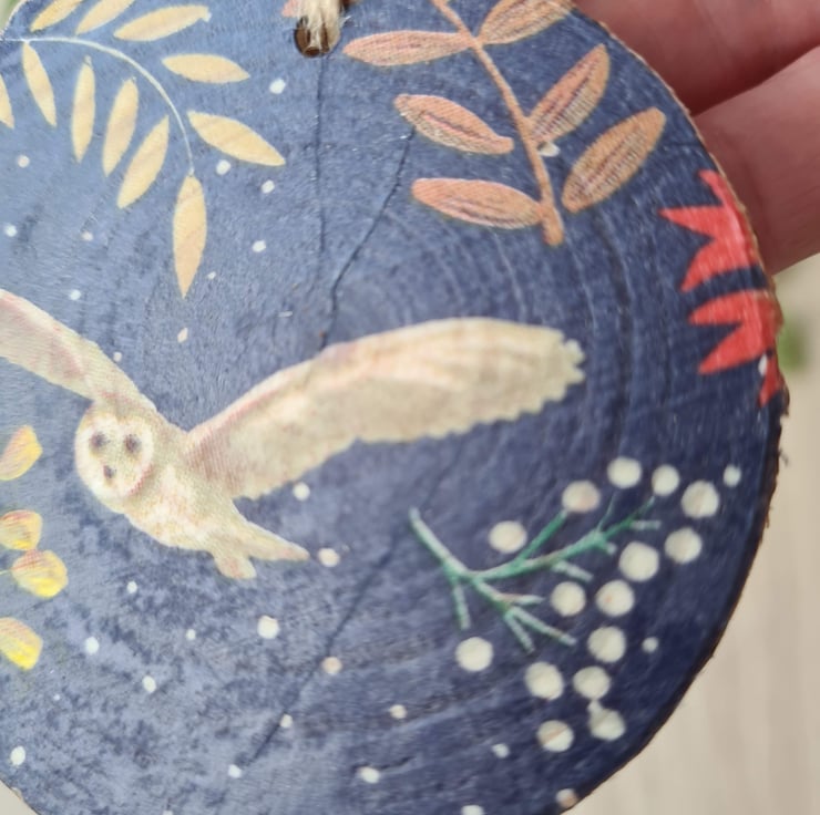You can feel the texture of the natural wood rings through the decoupage, and the natural bark edging all adds to its rustic charm. The decoration you receive will not look exactly the same as the one pictured as each wood slice is slightly different, but is the same design.