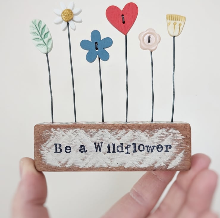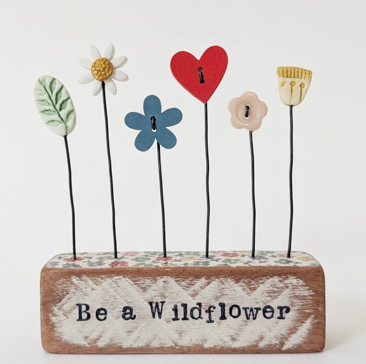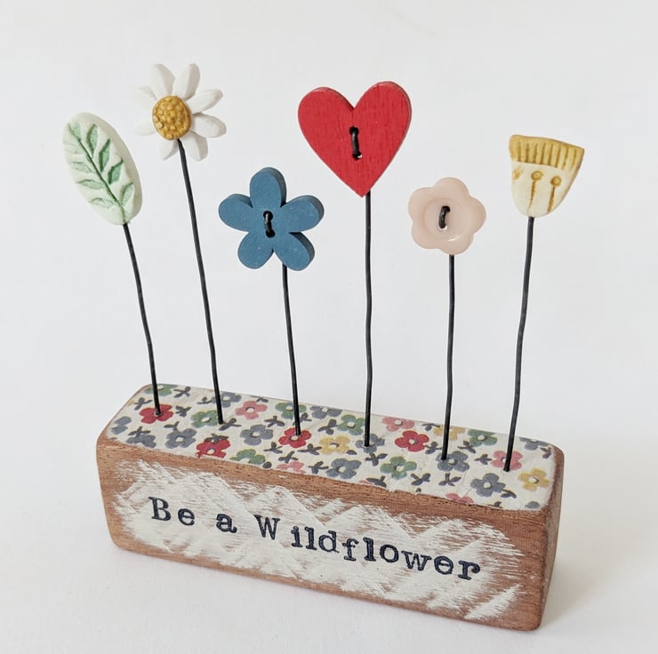 Button flowers grow in a row in this little garden with a clay leaf and flowers. They stand on their wire stalks in a wooden block with a decoupaged floral top.