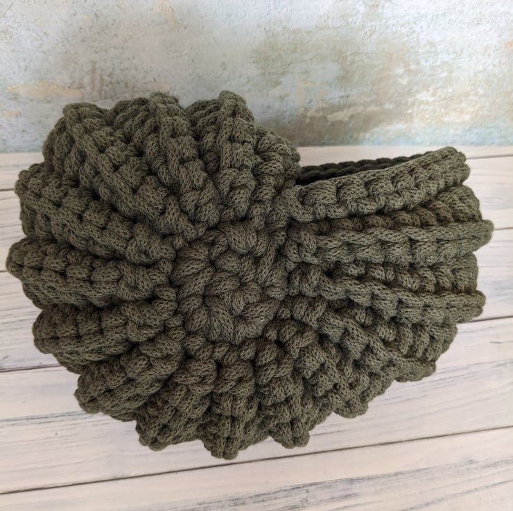 A beautifully tactile crocheted ammonite in Avocado made with a premium recycled 100% cotton braided cord. The item is very sturdy and keeps its shape and the cord gives great definition to the crochet stitches used to create it.