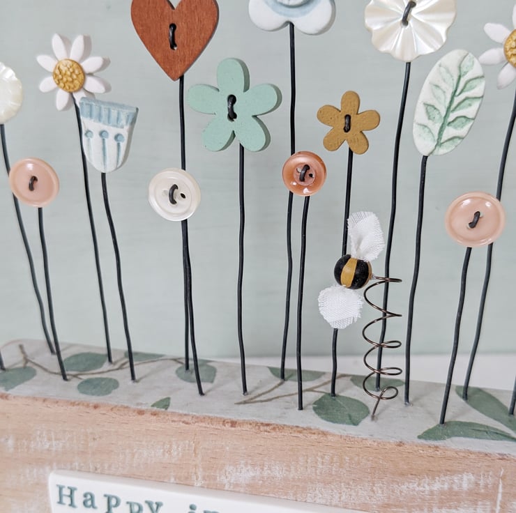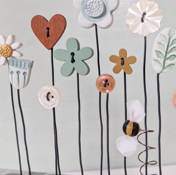 Button and clay flowers grow in this garden, standing on their wire stalks in a painted wood block.