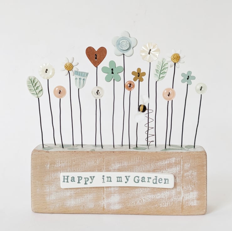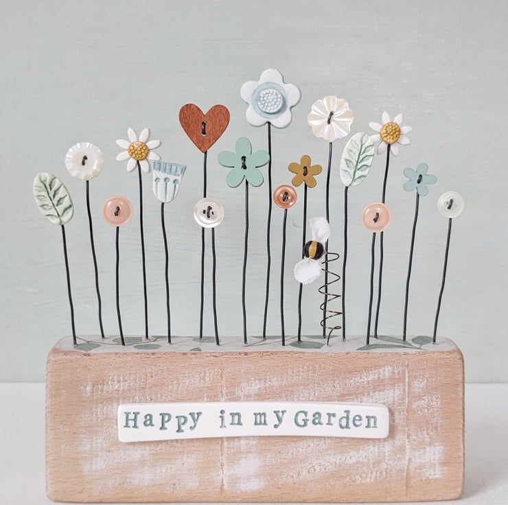 There are little button flowers and painted wooden ones. They dance alongside flowers and leaves made from polymer clay. This is hand moulded, fired and painted to finish.