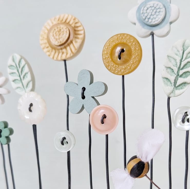 There are little button flowers and painted wooden ones. They dance alongside flowers and leaves made from polymer clay. This is hand moulded, fired and painted to finish.