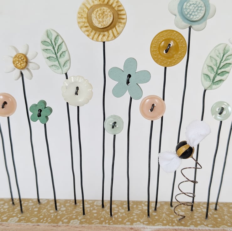 Button and clay flowers grow in this garden, standing on their wire stalks in a painted wood block.