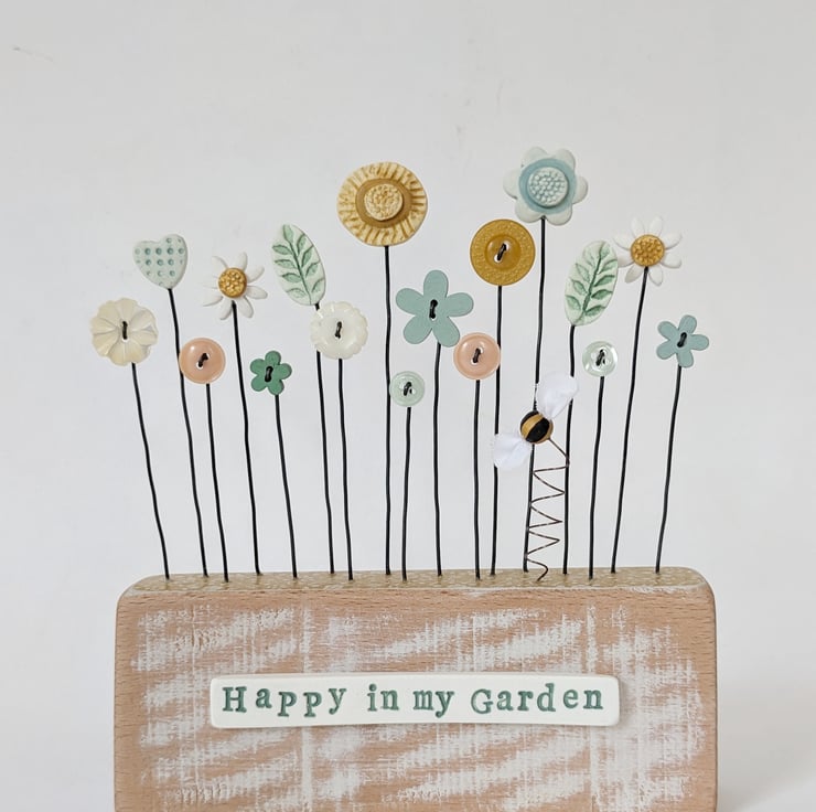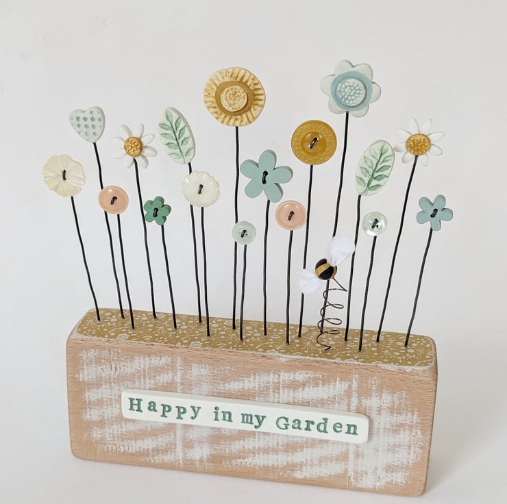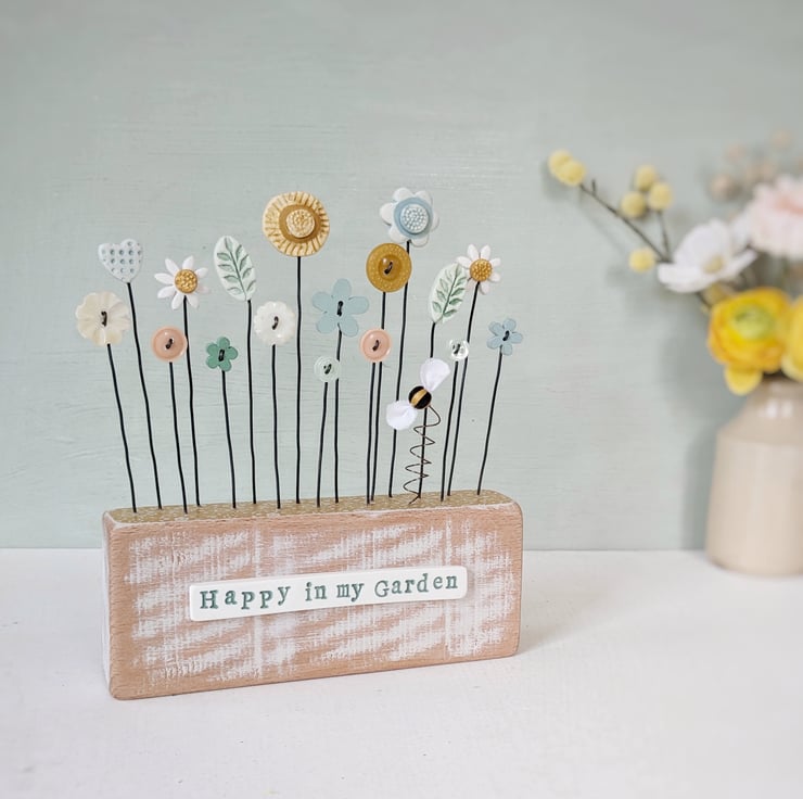 Clay and Button Flower Garden with Bee in Wood Block 'Happy in my Garden'