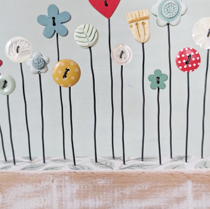 Button and clay flowers grow in this garden, standing on their wire stalks in a painted wood block.