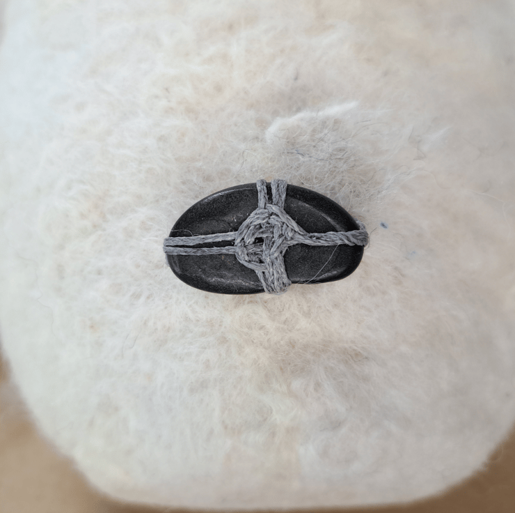 Features hand-stitched details and natural stones, one on the back to stabilise the bowl