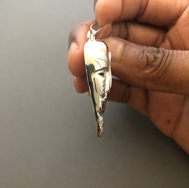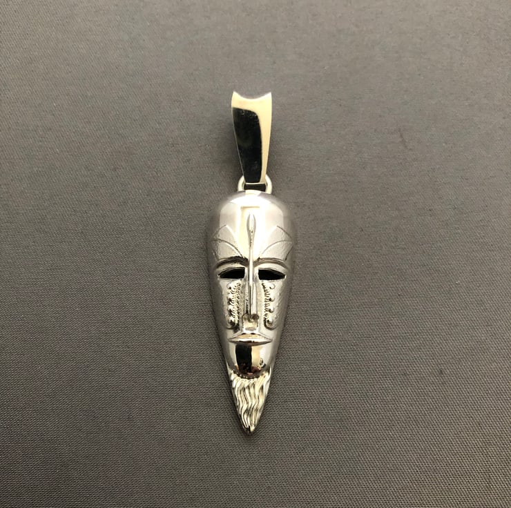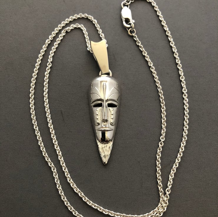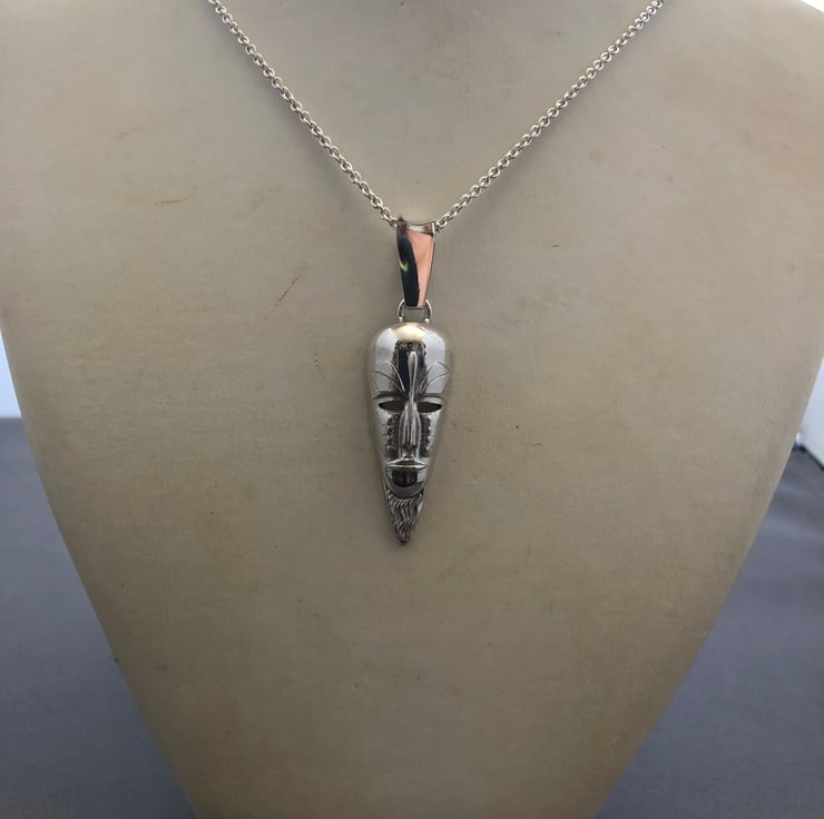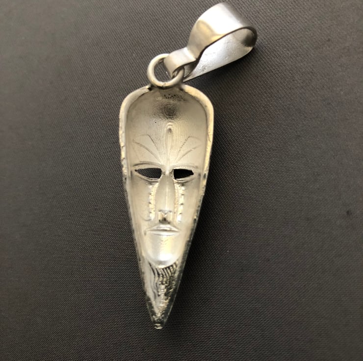 This is a African mask pendant and chain made out of solid sterling silver, the mask weight is 11 grams the chain weighs 7 grams and the chain length is 22 inches, length of pendant is 4-1/2 cm long, width of pendant is 1.7cm. The pendant comes with chain