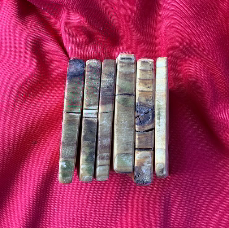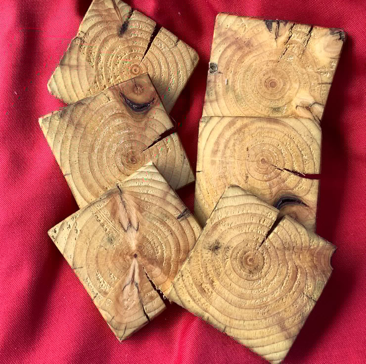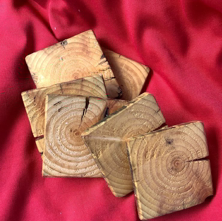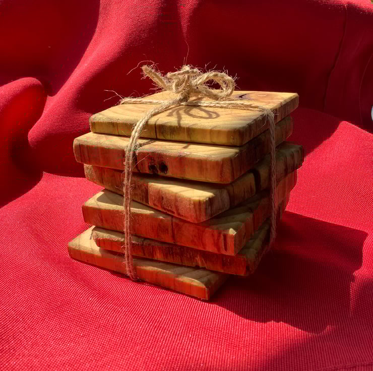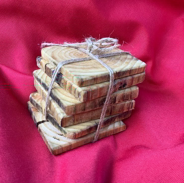 A nice set of six rustic wooden coasters. These have been made using reclaimed wood. They vary in depth and show the natural features of the wood. Each one had been oiled with natural linseed oil. Thy would make a lovely addition to an outdoor space.