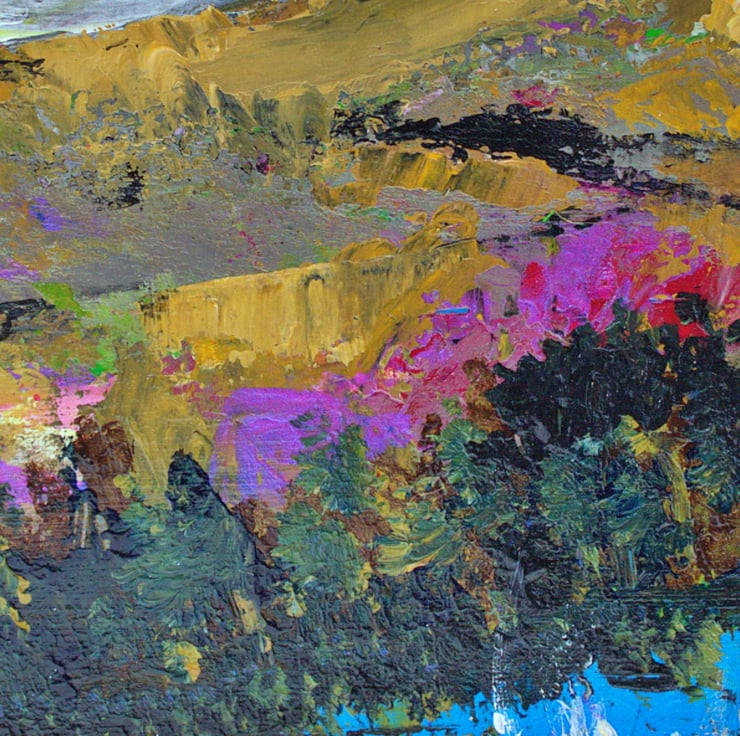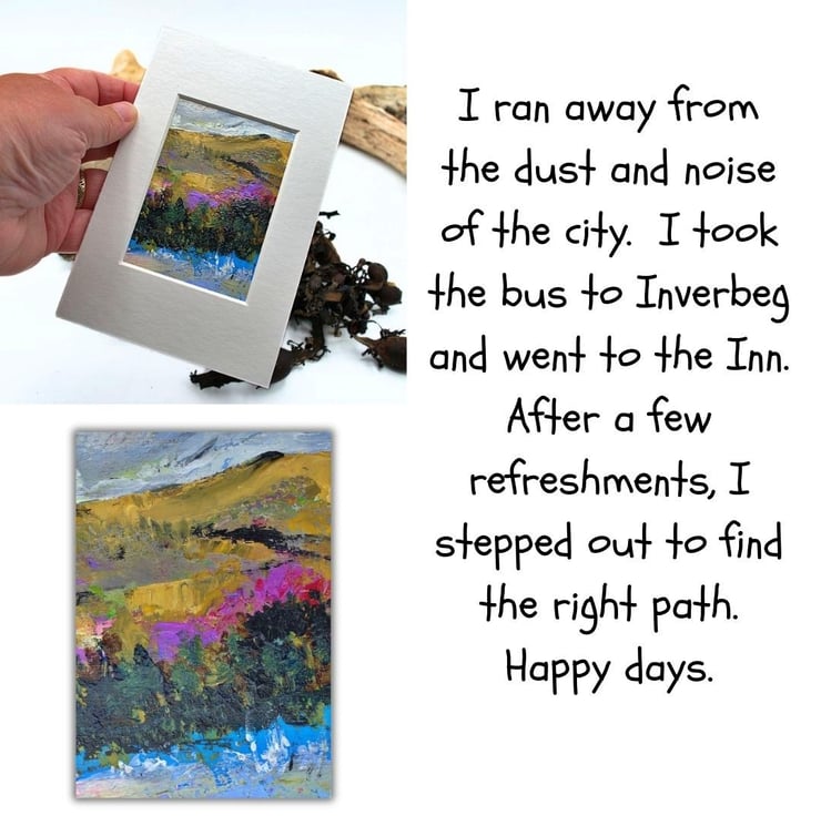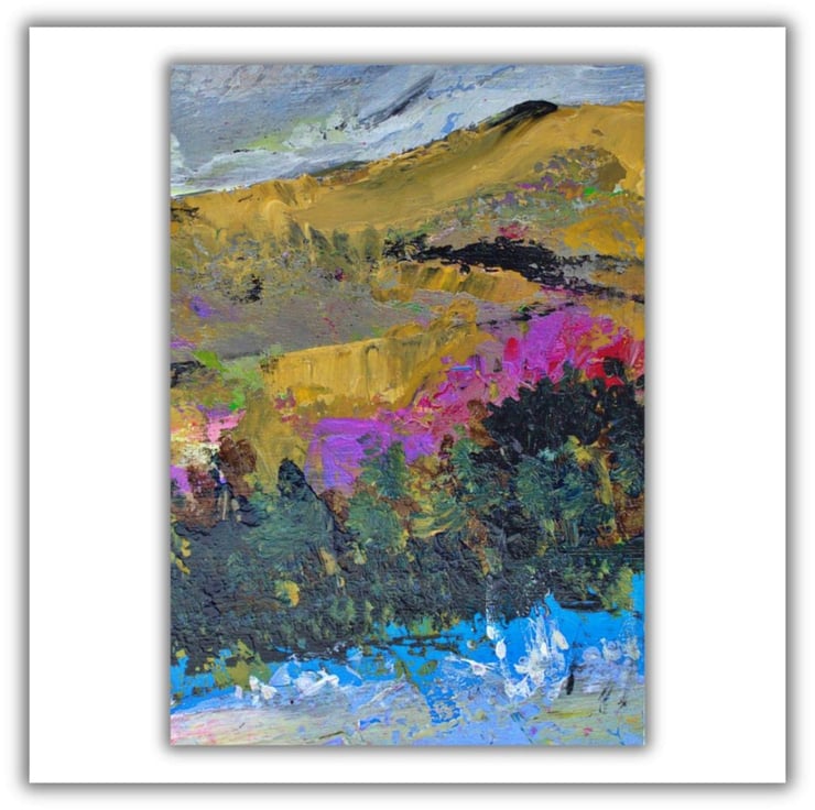 This is a small original landscape painting. The sky is full of heavy clouds clinging to the hill tops. The yellow ochre of the hills contrasts with the greens and pinks in the artwork. In the foreground, you can see a raging river cascading through the valley. I have used a combination of brushes and old pins to apply thick layers of acrylic paint on to the sealed paper. This will make an ideal letterbox gift.