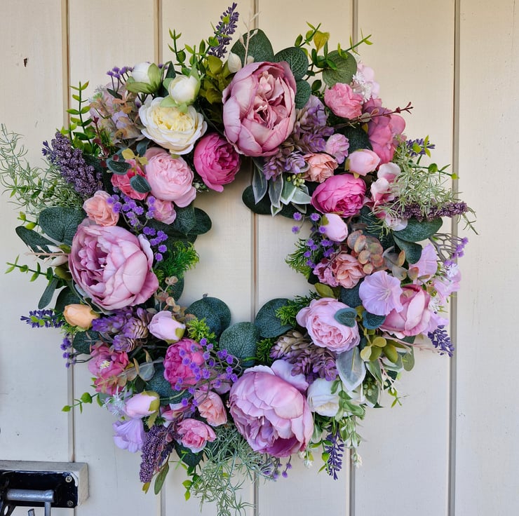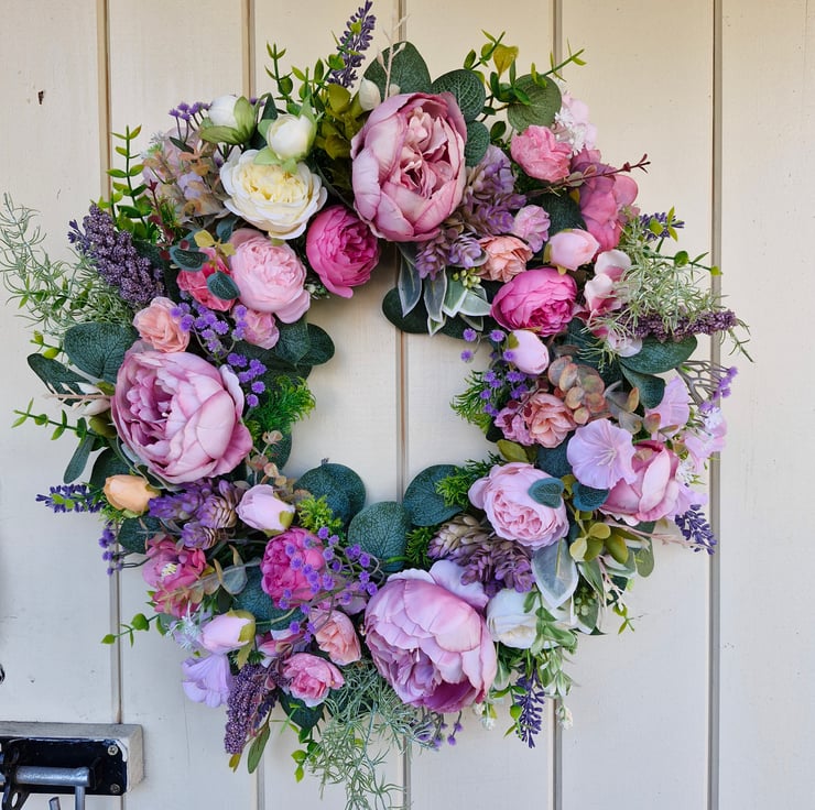 Large vintage style dusky pink peony,Roses & lavender wreath.