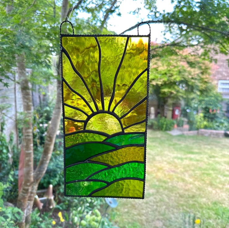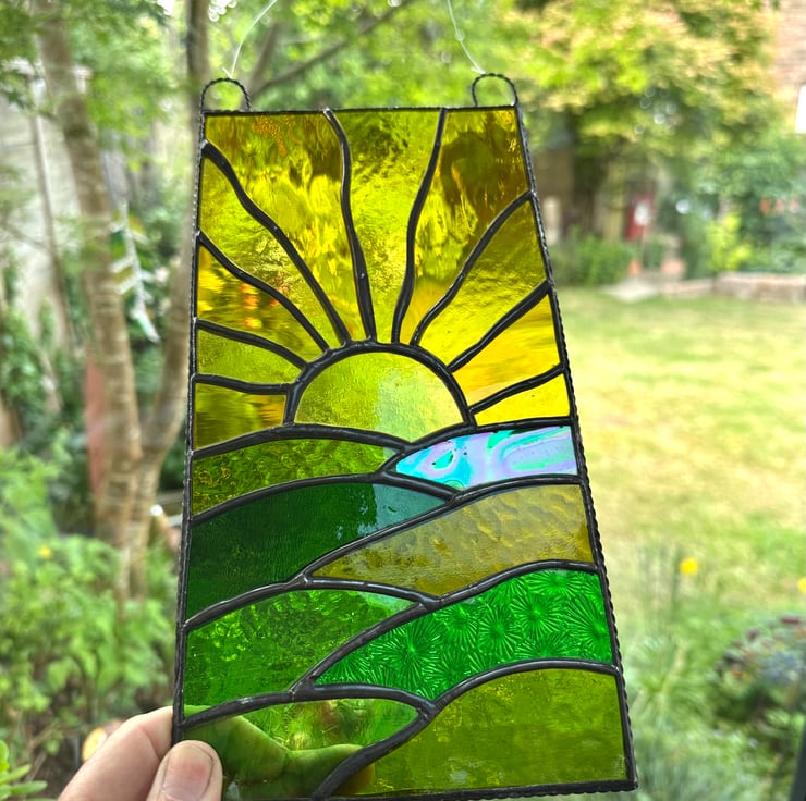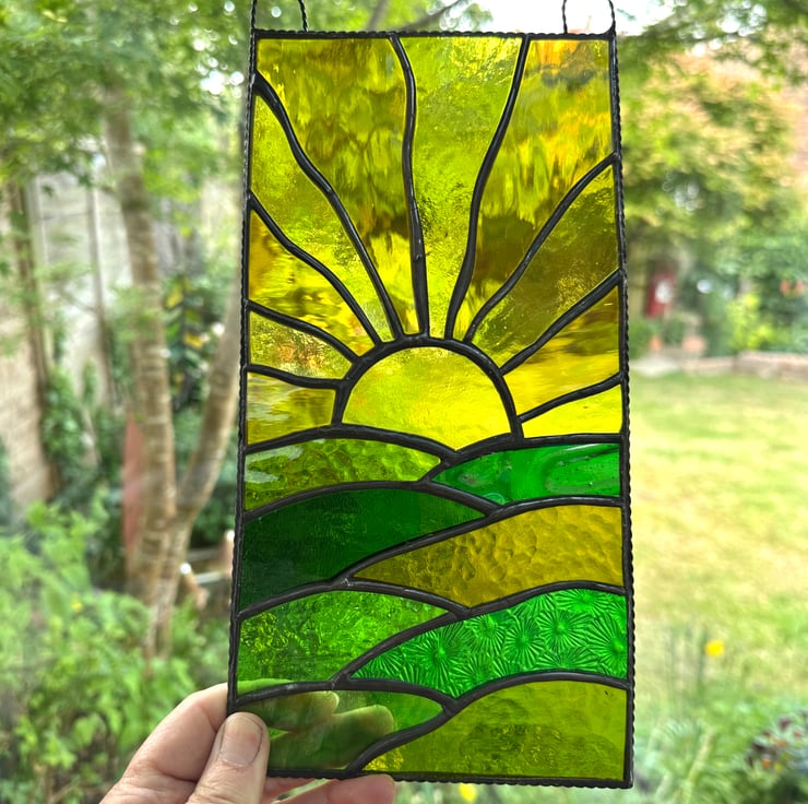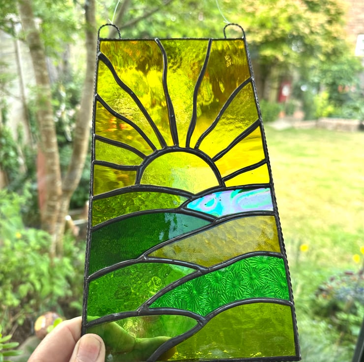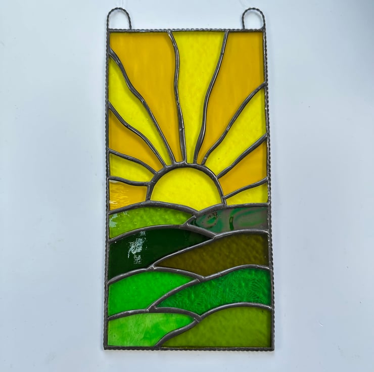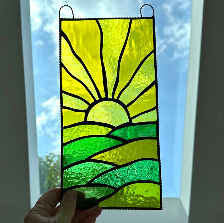 I have used 8 different types of green stained glass for the hills which have a lovely mix of textures and 2 types of yellow glass for the sun and sun rays.