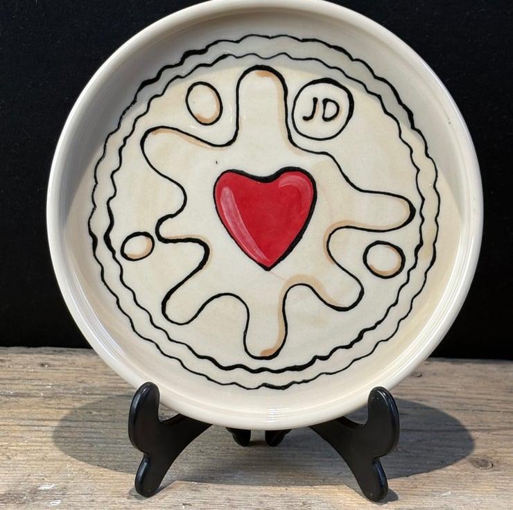This hand-painted, wheel-thrown, plate is made from high-fired glazed stoneware and designed to look like a massive Jammie Dodger, makes for an eye-catching addition to your kitchen or dining table.