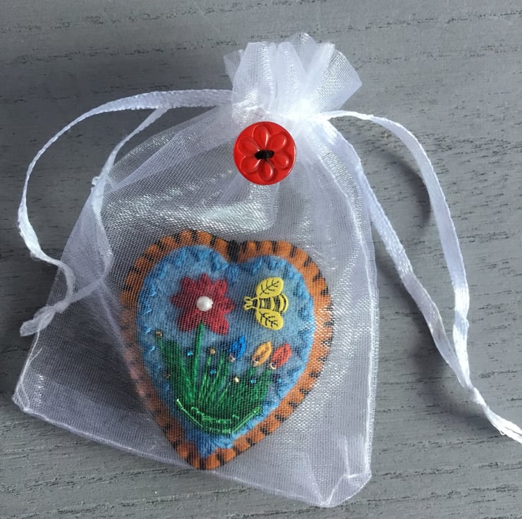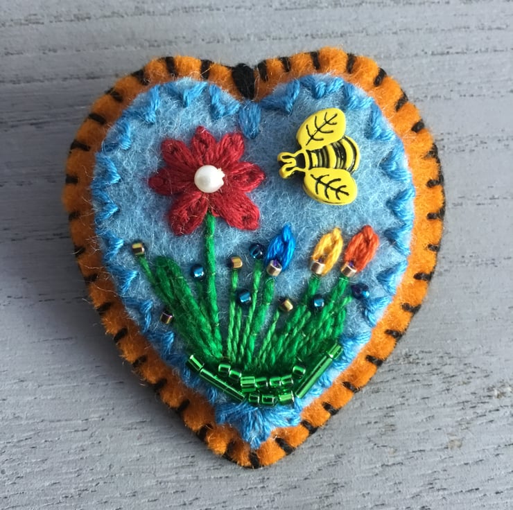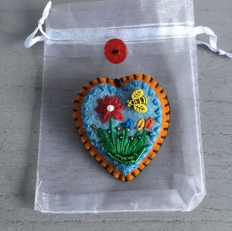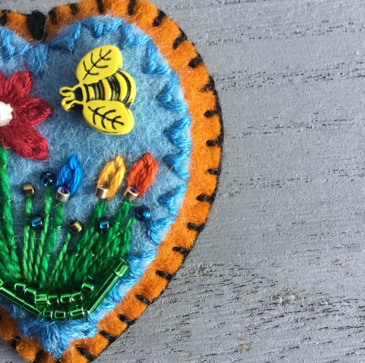 This Hand Embroidered Bee Brooch has a lovely garden scene, a Bee button is stitched onto pale blue and orange felt hearts. She’s buzzing over a border of garden flowers, hand embroidered in red, blue, yellow and orange threads, decorated with a pearl, blue, golden and green seed beads.