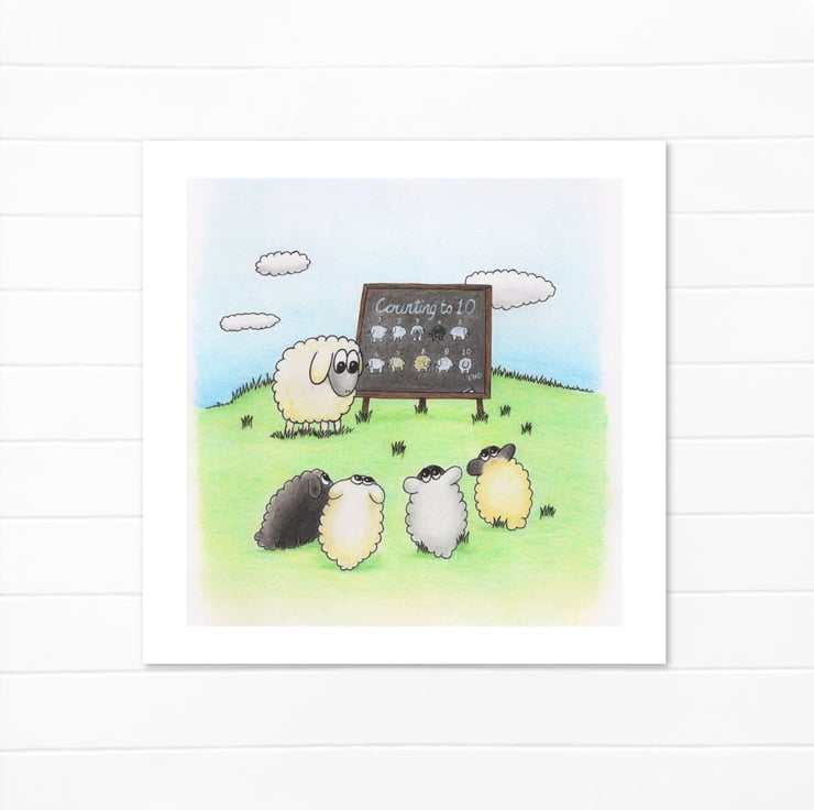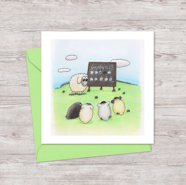 An original art greeting card, featuring a hand drawn pencil illustration of a young lambs learning to count sheep. Fun card for any occasion.