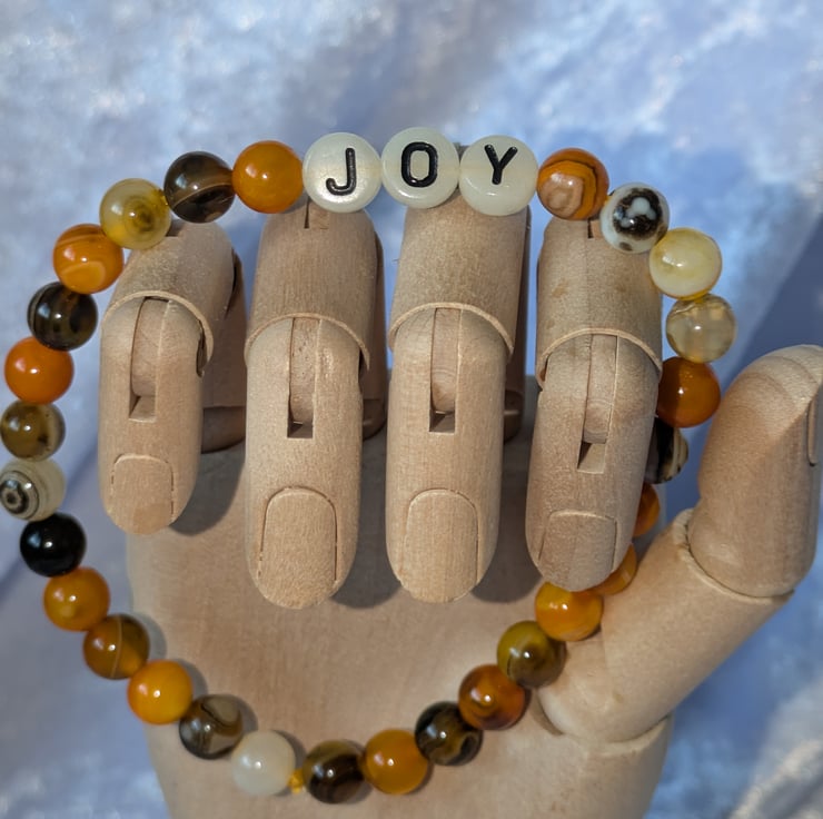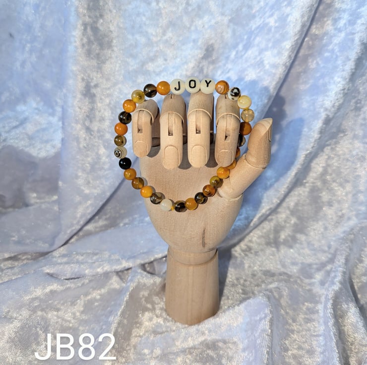 Orange, brown, yellow and white, the beautiful colours that make up bumblebee jasper, can be seen in their full glory in this bracelet. It also has the word 'JOY' on glow in the dark rondelle beads. The glow can be activated by sunlight or UV light.