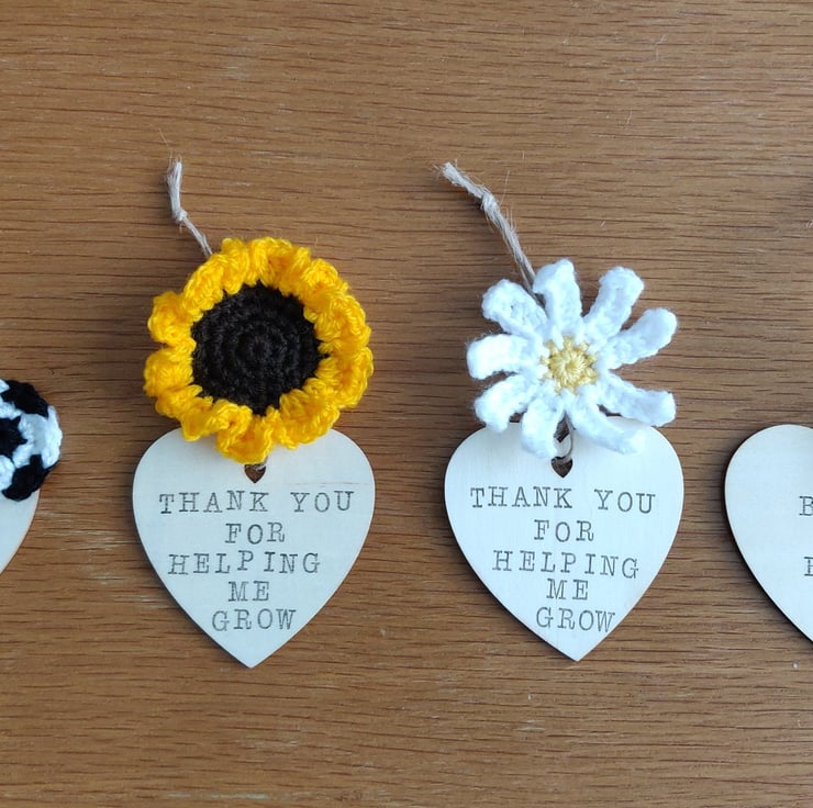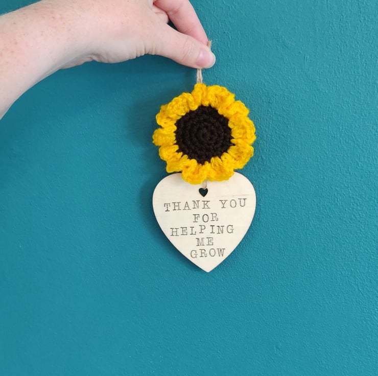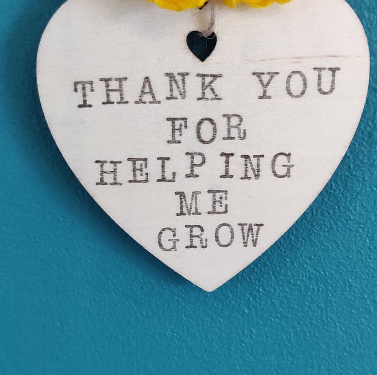 This wooden hanging heart sign has a lovely sentiment with a hand stamped message 'Thank you for helping me grow'.