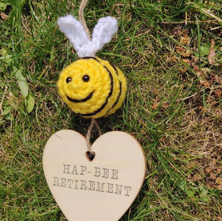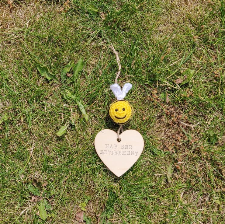 The wooden sign has the wording 'hap-bee retirement' with a cute crochet bee on top.