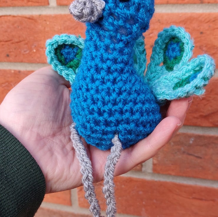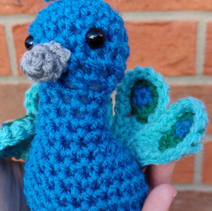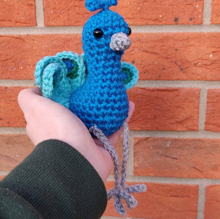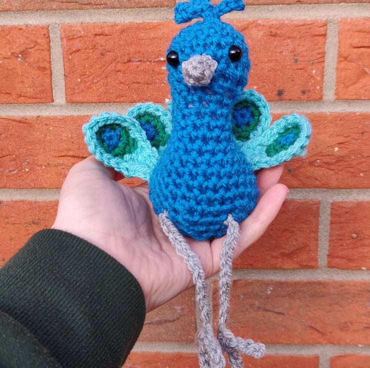 This crochet peacock has been crocheted in beautiful blue and green for a bold design.