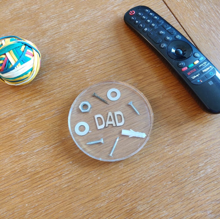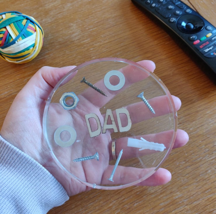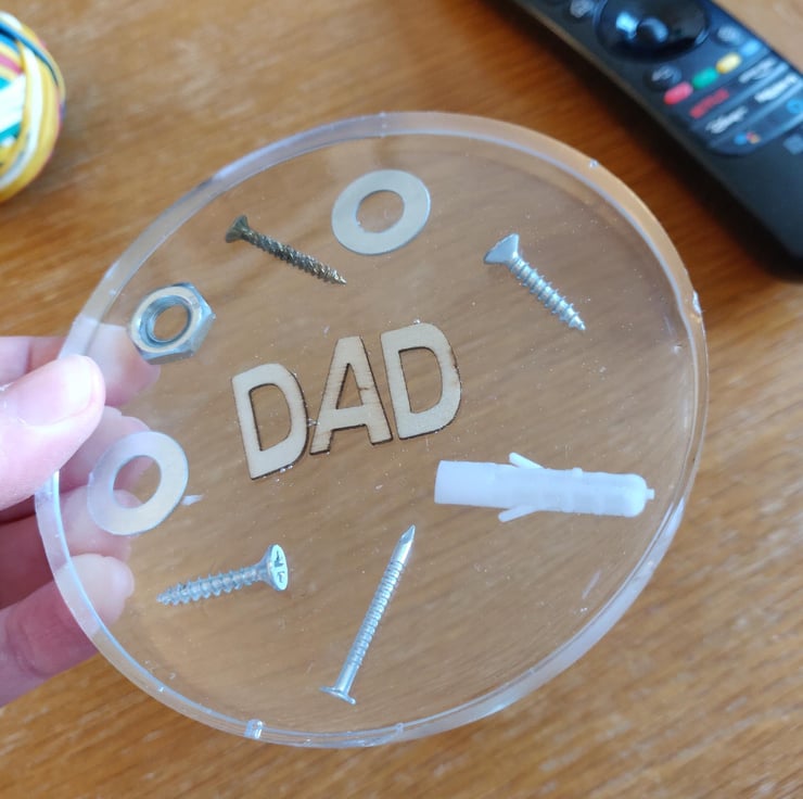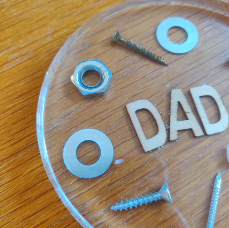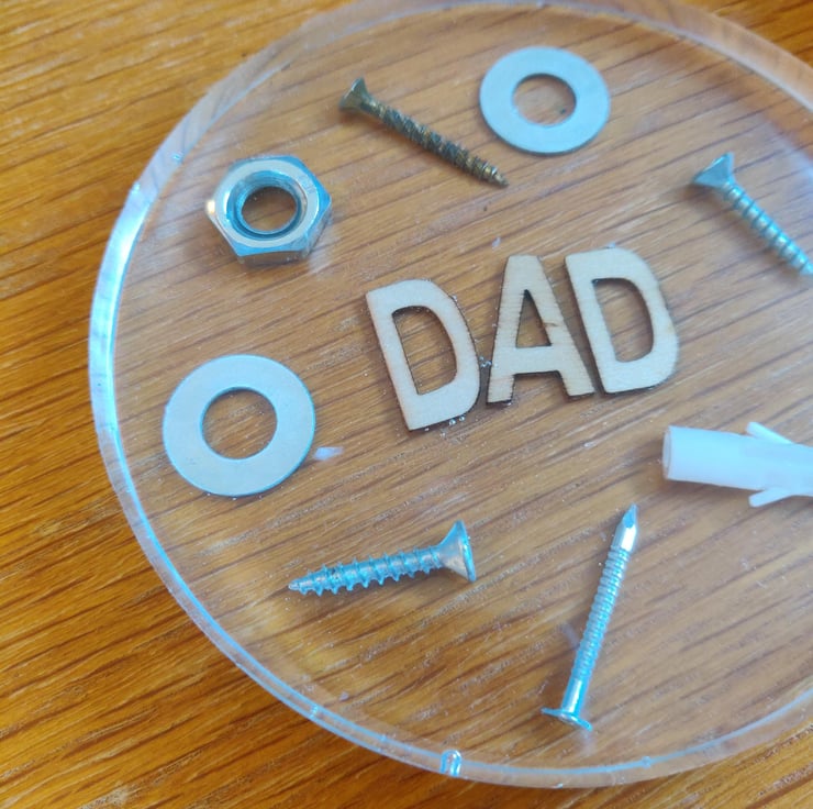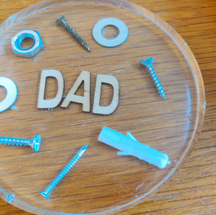 Designed with wooden letters with the name Dad (or any name you like) and a selection of screws, wall plugs and bolts, each coaster is a unique celebration of creativity and craftsmanship.
