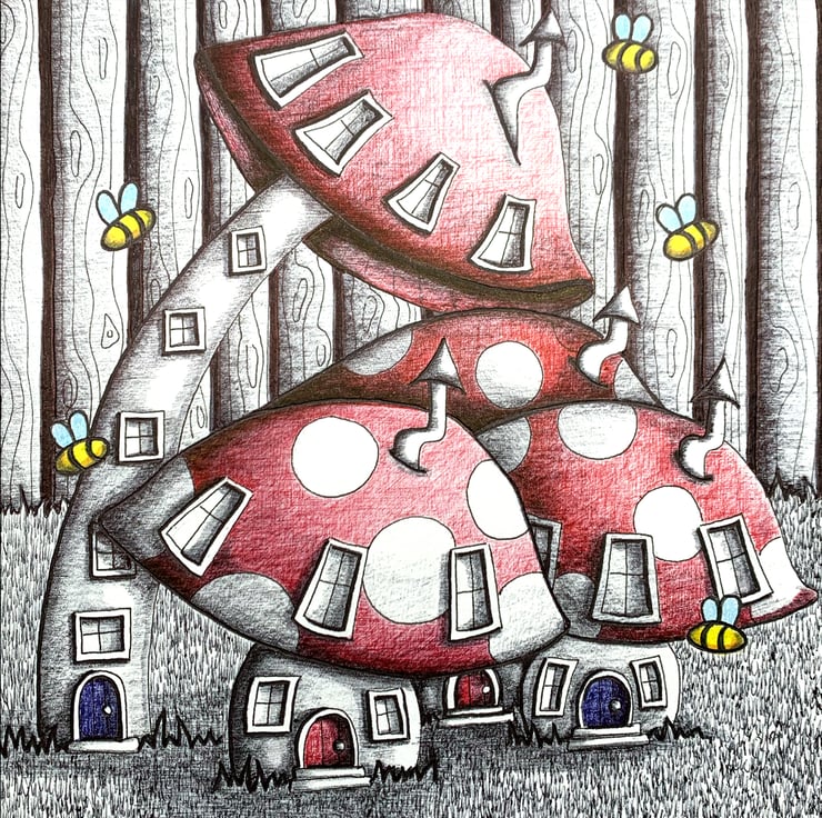 A pen and ink illustration of fantasy mushrooms / fairy village.