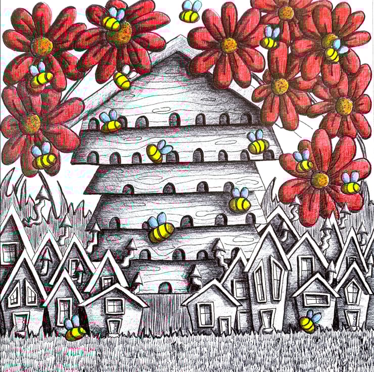 A pen and ink illustration of a busy bee hive.