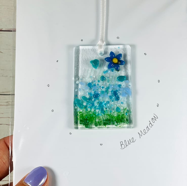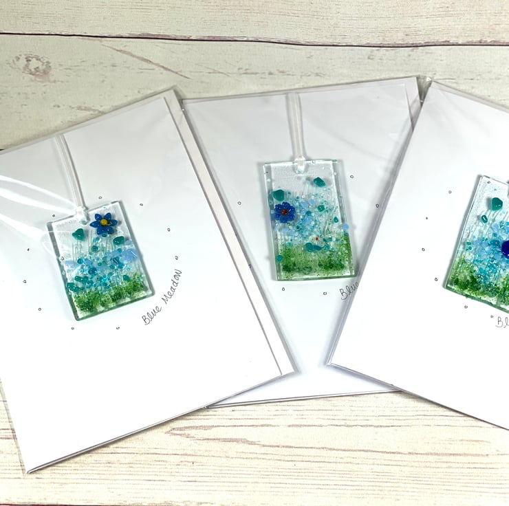 Fuse glass hanging decoration on a blank card for any occasion's where you want to give a small gift . Delicately designed to replicate the look of a meadow of blue flowers . A beautiful keepsake to remember the occassions which can be hung anywhere in the home when the card is no longer required .