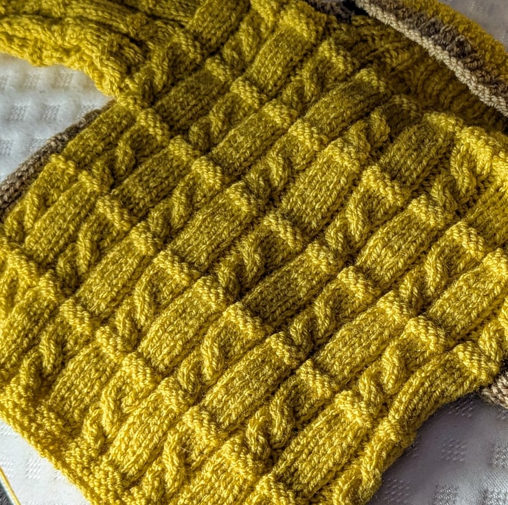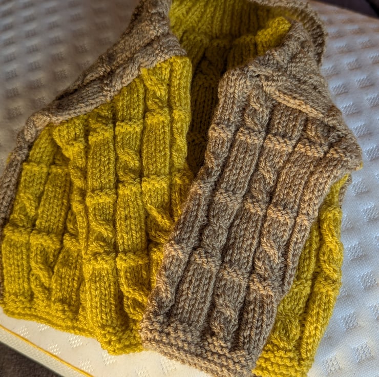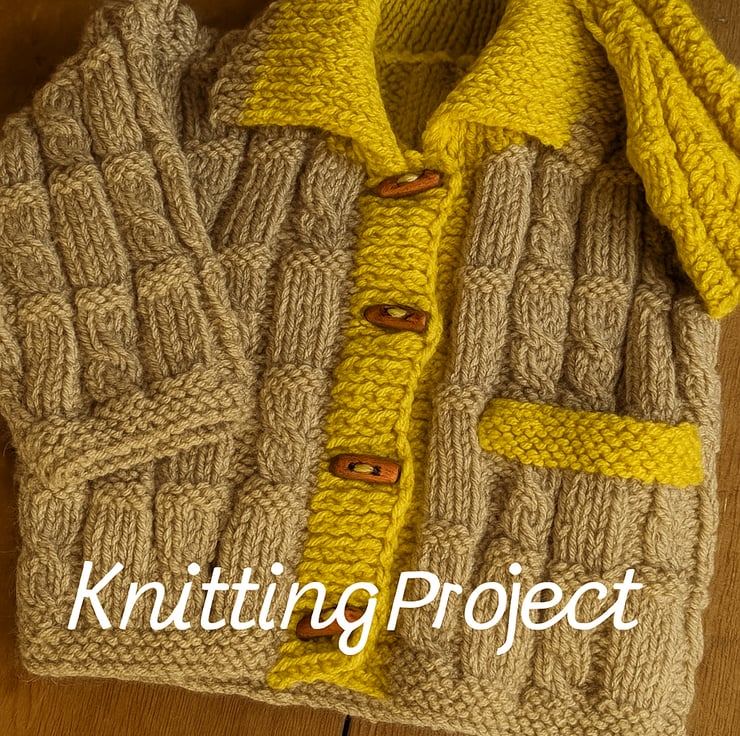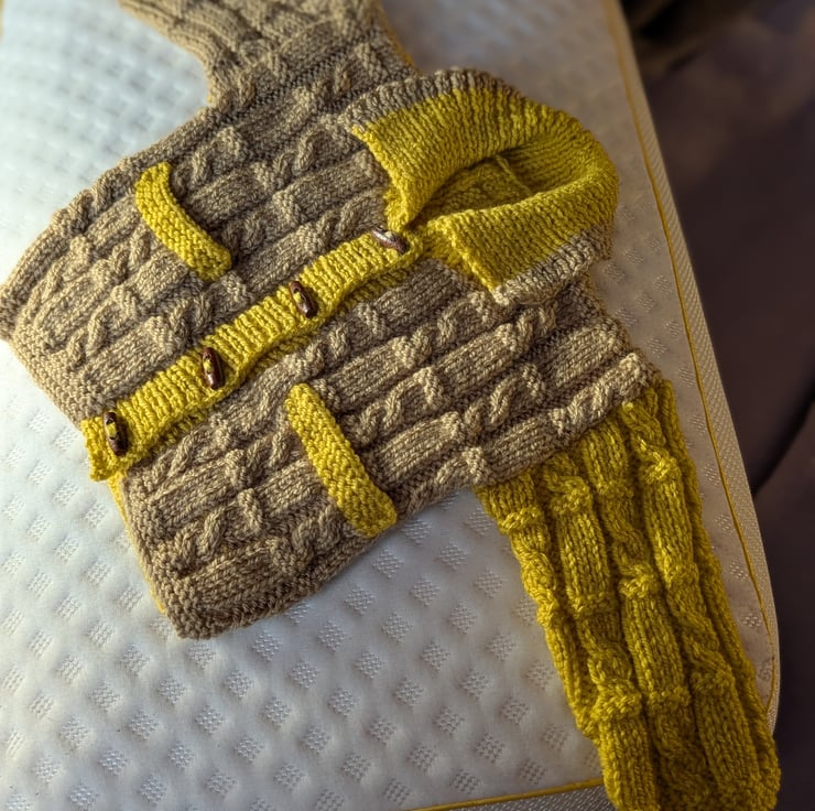 3 to 6 months of age, toggle buttons, collar, and pockets. Striking colours of Ochre and Biscoff mixed to perfection.