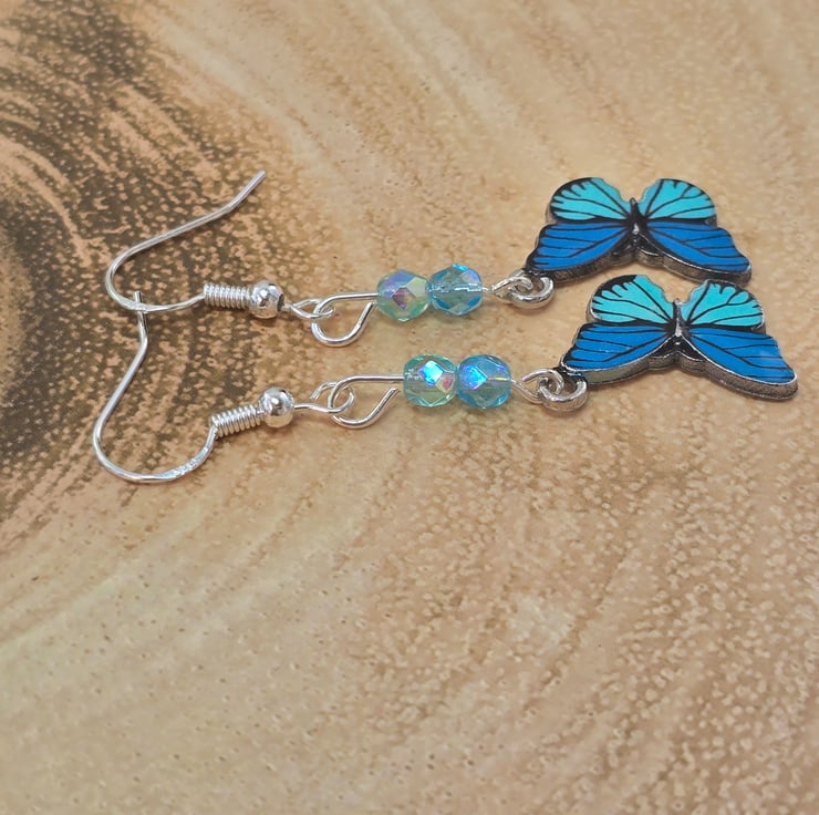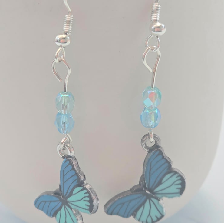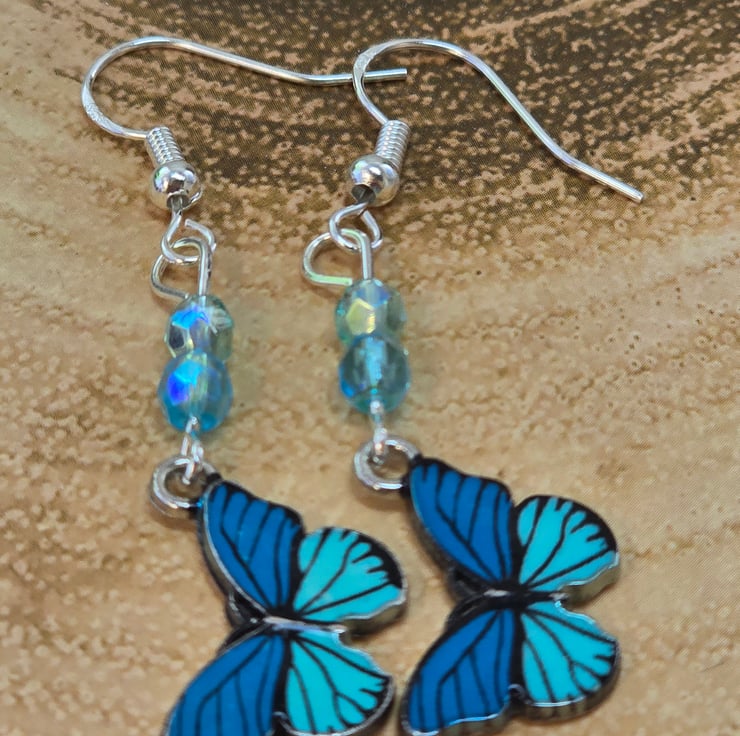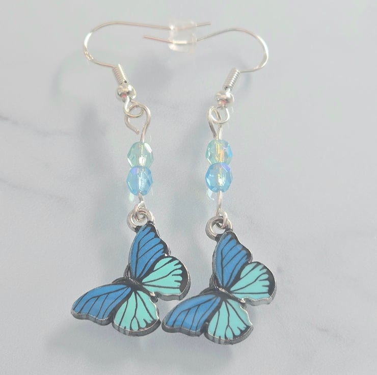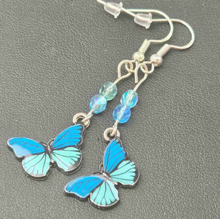 The earrings have been made using light and dark blue fire polished faceted beads with a light and dark blue butterfly enamel charm at the bottom. The hooks are Sterling silver and hypoallergenic.